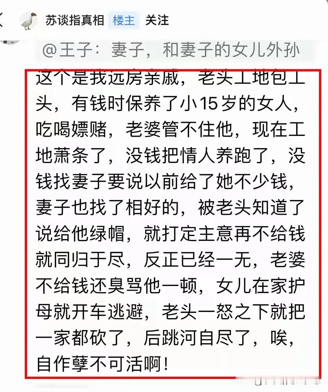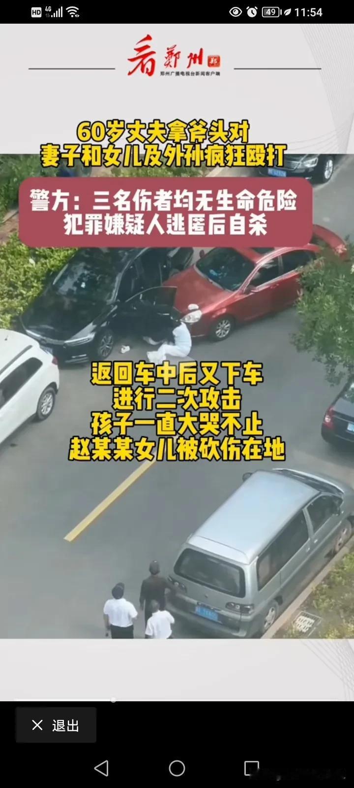 一老头拿了个斧头把自己的老婆、女儿和4个月大的孙子都砍了,现在女儿已经出普通病房,4月大的孙子和老婆还在ICU,事情的原因居然是情感纠纷,真是够狠的! 从网友拍下来的视频显示,这名男子开车直接把对方撞停,坐在地上的白衣女子不停的骂,男子回车里拿出了斧头就把3个人都砍了逃逸,最后自杀了。 女子的老公在筹款平台上发布自己25岁的老婆,四个月的儿子,还有岳母,脑出血加身上多处骨折,筹款50万。 知情人透露,这是一个重组家庭,这个杀人的老头是继父,他年轻的时候是个包工头,那时候工程多,所以他赚的不少,吃喝嫖赌样样齐,还包养了一个小自己15岁的女人。 他的老婆又管不住也就随着他了,后来因为工地的活不好接了,老头把钱用光,包养的女人也离开他了,没有钱的他就回去问老婆要钱,说自己以前风光的时候给了不少钱给老婆,现在要回一点也应该,而且他老婆因为他的出轨也找到了相好,被老头知道了,所以两人发生了争吵,当时女儿就在家里,为了避免两人争吵,所以女儿带着老妈驾车离开,但没想到老头因为没拿到钱,再加上老婆给了他戴绿帽,一气之下开车就把他们的车给撞了,双方之间发生了激烈的争吵,老头情绪控制不住,直接从车里面拿出了斧头,把女儿、老婆还有四个月的外孙子都砍了。 后来这个老头也跳河自杀。 唉,真的是可悲啊,两个家庭都碎了,这老头也够狠的了,四个月的孩子也不放过。