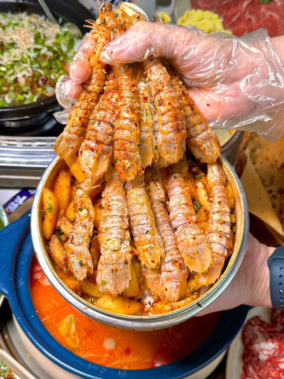 选择困难症有福了,多种海鲜搭配,一整盘可以吃到黑虎虾、鳗鱼、鱿鱼等,搭配上秘制蘸料,一口下去真的过瘾
