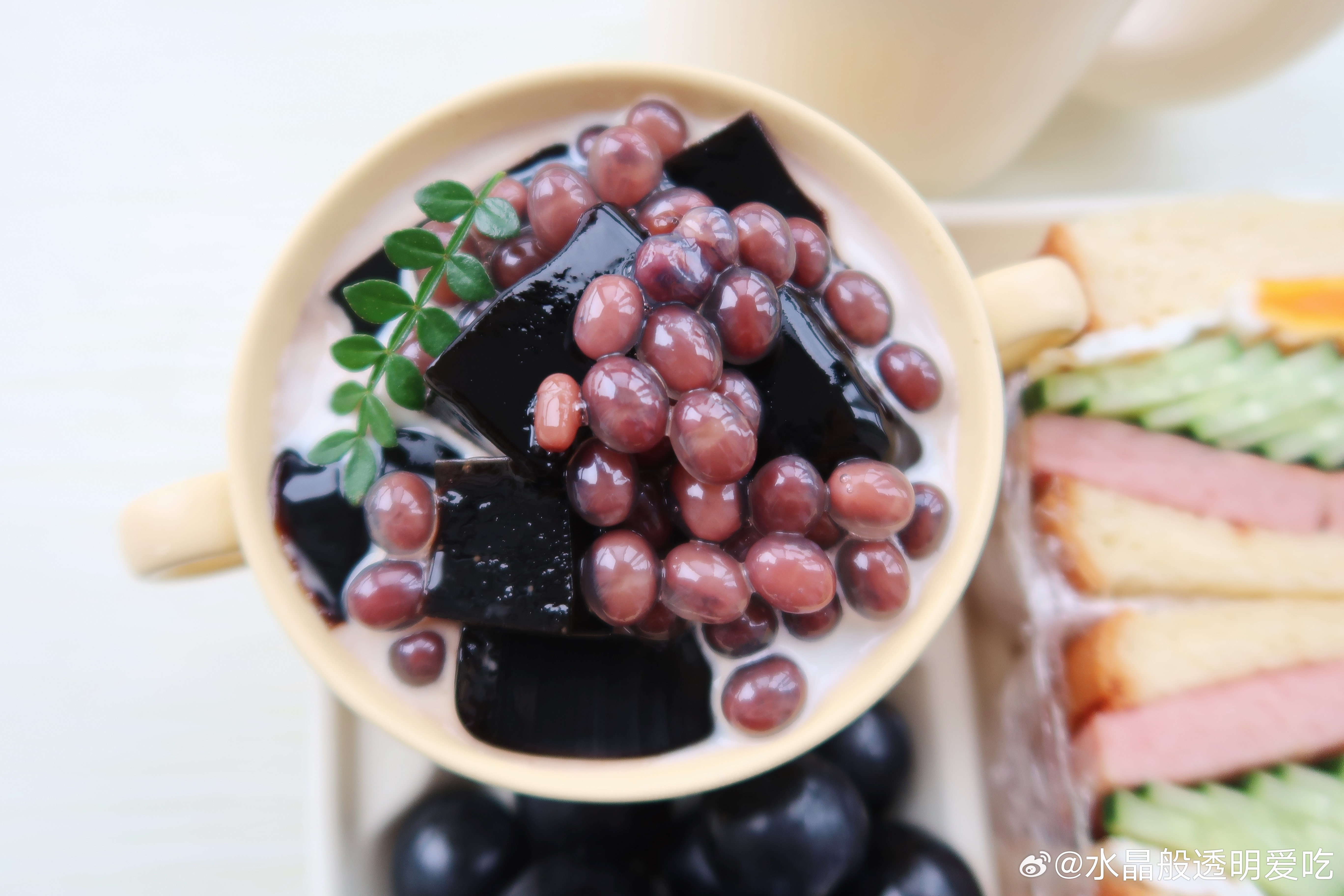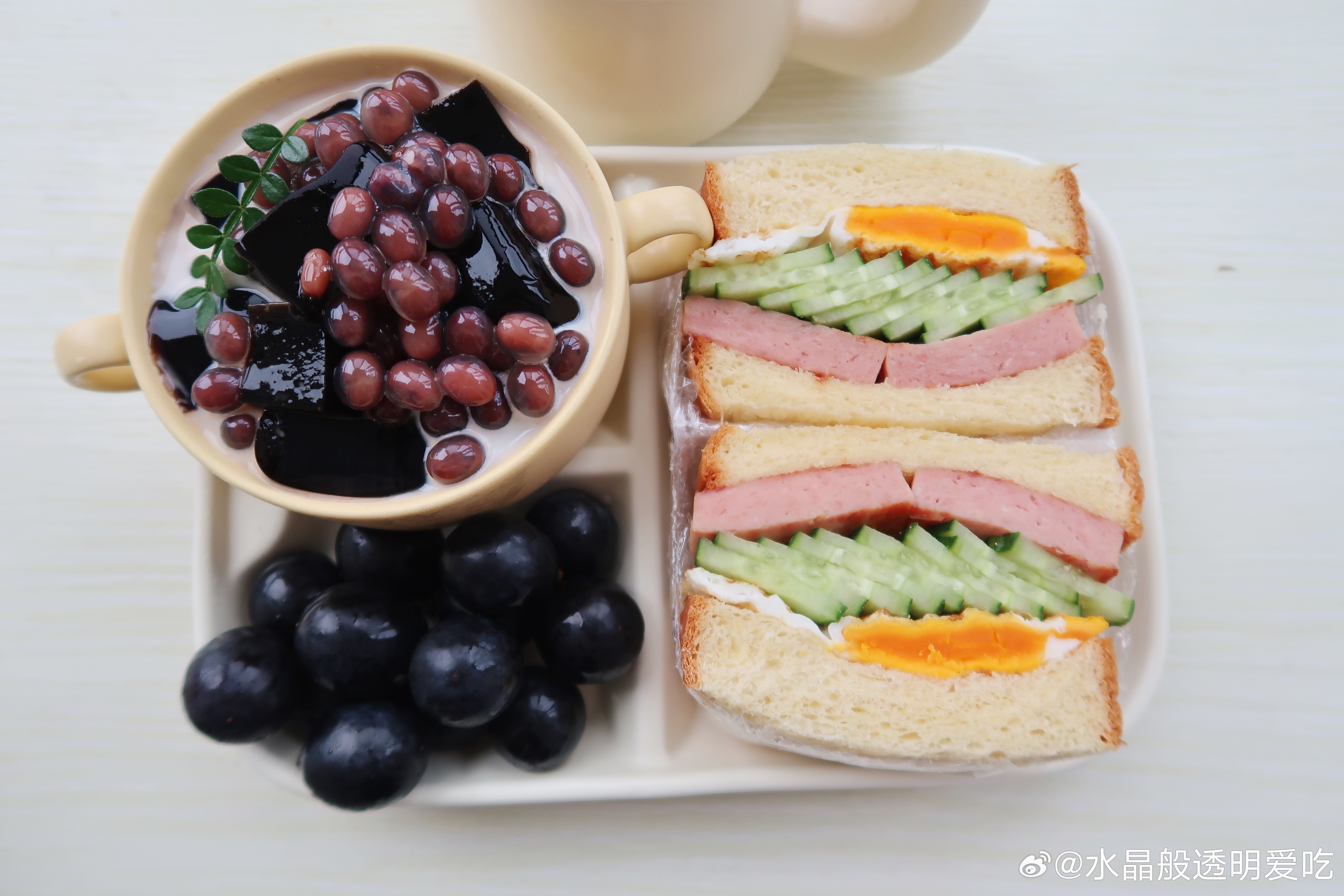 早.今天的早餐是黄瓜火腿三明治🥪红豆烧仙草🍧夏黑葡萄🍇牛奶🥛