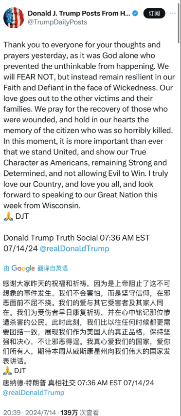 特朗普在7月14日东岸时间7:36发了条消息:感谢大家昨天的祝福和祈祷,因为是上帝阻止了这不可想象的事件发生。我们不会害怕,而是坚守信仰,在邪恶面前不屈不挠。我们的爱与其它受害者及其家人同在。我们为受伤者早日康复祈祷,并在心中铭记那位惨遭杀害的公民。此时此刻,我们比以往任何时候都更需要团结一致,展现我们作为美国人的真正品格,保持坚强和决心,不让邪恶得逞……”