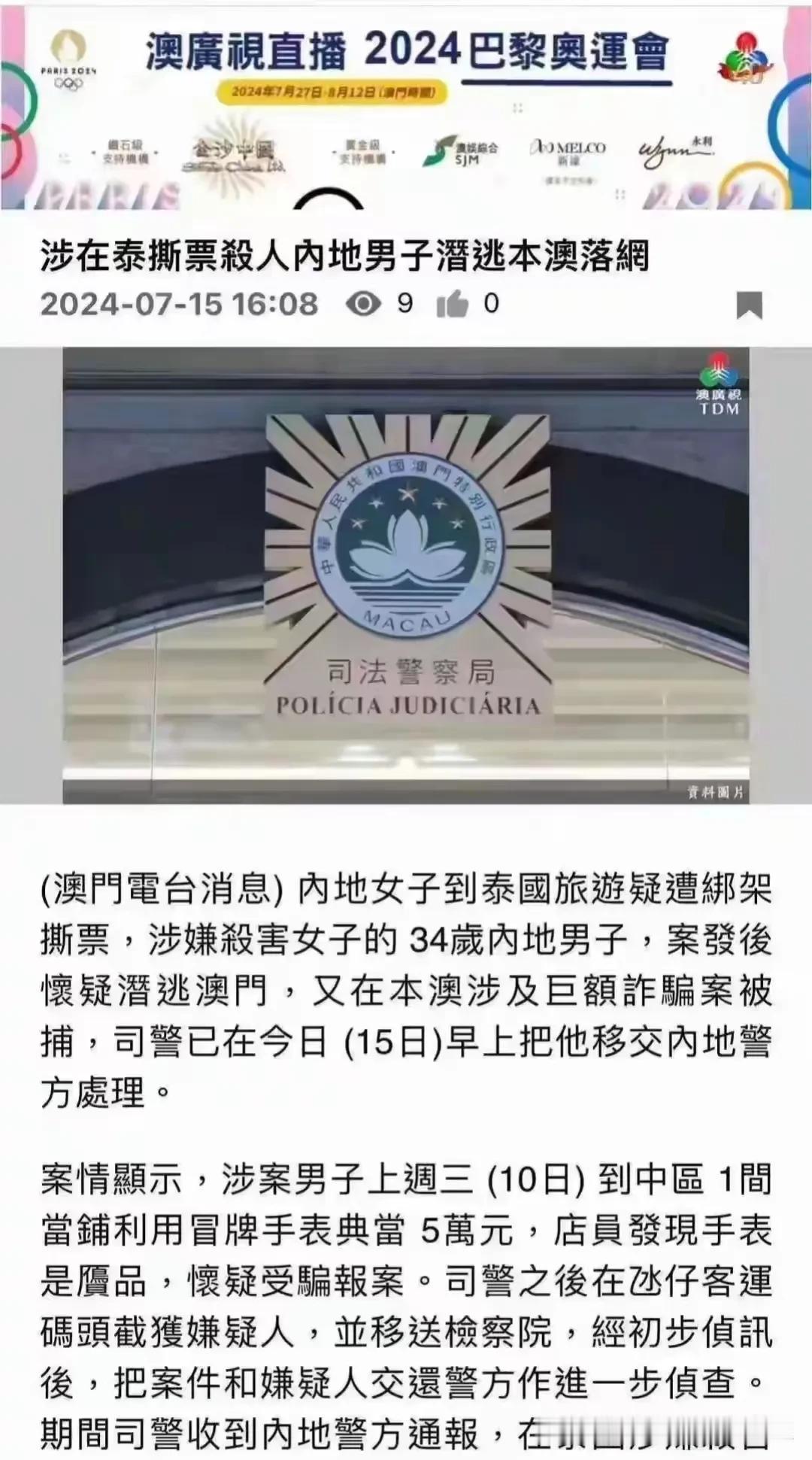 这是澳门官媒报道34岁姓马男子在泰国杀害38岁女子在澳门抓捕的详细过程,男的拿着女的名表去的典当行当了5万块钱,拿着这5万又跑回赌场去赌,一心想翻本赚的路费好逃亡,但没想到被典当行的职员后知后觉才发现表是赝品,所以才选择报警。 该名男子想要通过氹子码头逃回香港再择路线逃跑,没想到的是泰国公安早就通知了香港和澳门的警方协查,这名男子打死也没想到,自己卖了个假货,还因此暴露了自己。 从警方透露的消息可以得知,该名男子身上还背负了另外一单巨额诈骗罪,综合这几天网上报道的信息,可以得出该男子好赌成性,经常利用杀猪盘诈骗巨额作为赌资。 泰国警方查询到该男子有多次泰国出入境记录,30号,他从新加坡独自飞往泰国,7月1号见了女子之后对她实施了谋杀、窃财、撕票、理尸后,3号从泰国飞香港再去澳门赌场。 这名男子走的路线就暴露出来他就是一名的赌客。 这名男子表面就装有钱,实际穷的很,因为好赌,所以以杀猪盘的方式实施诈骗获得巨额,但没想到因为好赌,一赌成魔,一有钱就忍不住想要赌,结果最后也被赌场榨干了。 他应该是有目的接近死者,而且关注了她的动态好久,有可能是因为死者晒出价值12亿流水的澳门狮王卡,引起了他的注意,所以开始有预谋的引诱和接近。 刚好这个女的又不是单纯富婆,所谓的炫富全都是假象,因为职业需要,什么名牌包包,名牌手表,全都是赝品买来只是装样子,钓凯子用的,双方都以为对方就是目标,结果男骗子遇到了女骗子。 男的想着在异国他乡好下手,他是万万没想到假货害人,在DNA没出来之前,泰国警方就通过女子胸部假体确认了身份,本来想着拿了女子的手机就可以到澳门消费,没想到只消费了两次就被跟踪了,家属就把卡给冻结了,没钱怎么翻本?想着把女的表卖了吧,没想到还行,卖了五万块钱,那时候他心里应该窃喜吧,结果被店员发现是赝品报了警,冒着极大的风险杀人越货结果越的货都是假的,估计这名男子知道之后心中有一万个草泥马,在奔腾吧! 这件事情告诉我们一个道理,做人要低调,越高调死的越惨,表面上装富的那些人有可能就是个穷鬼,越缺啥就越晒啥,女人不要独自外出,特别是去东南亚地区,最后一句交友请谨慎,天下没有掉下来的陷阱,有可能掉下的是夺命请柬! #记录我的2024#