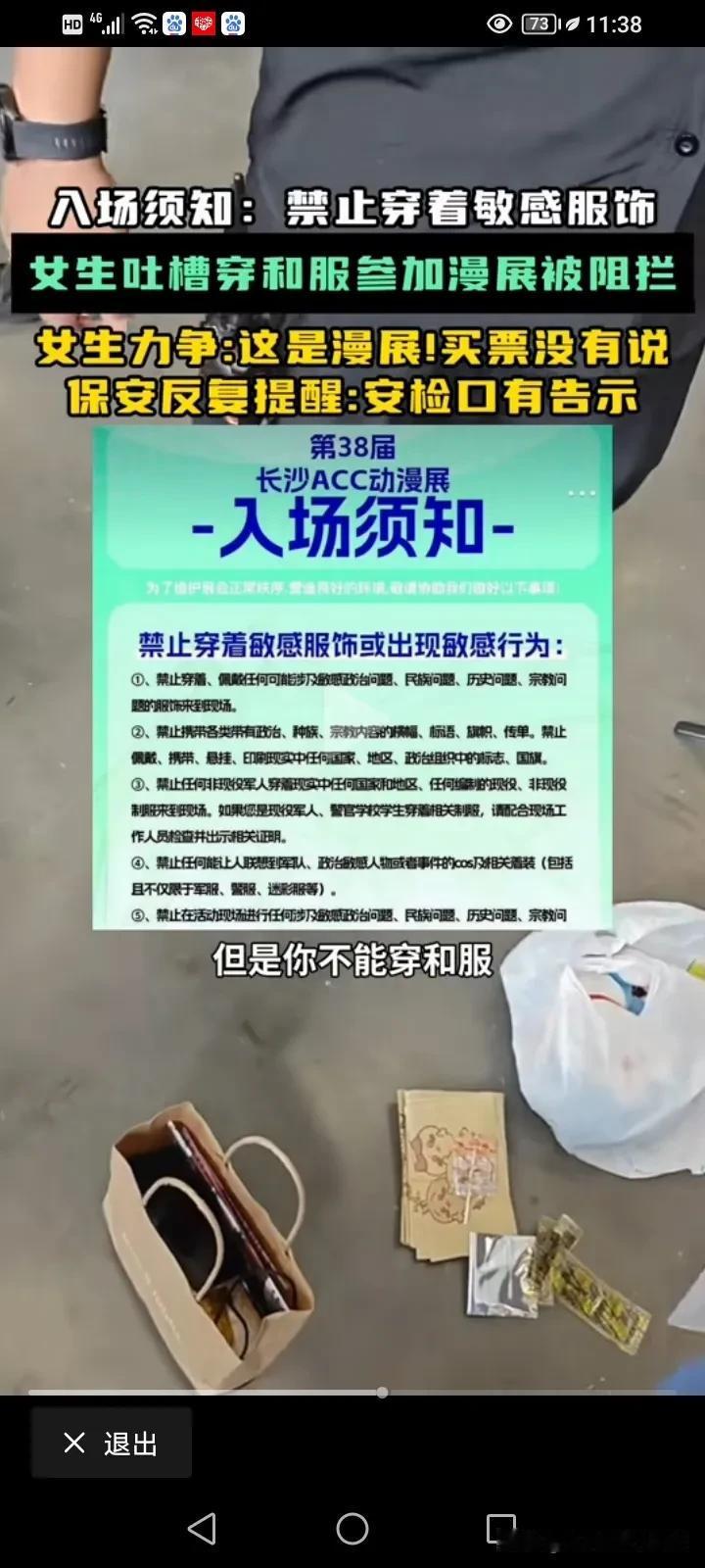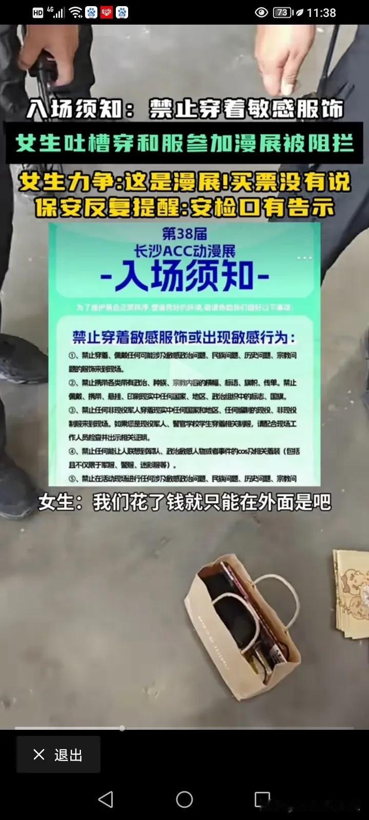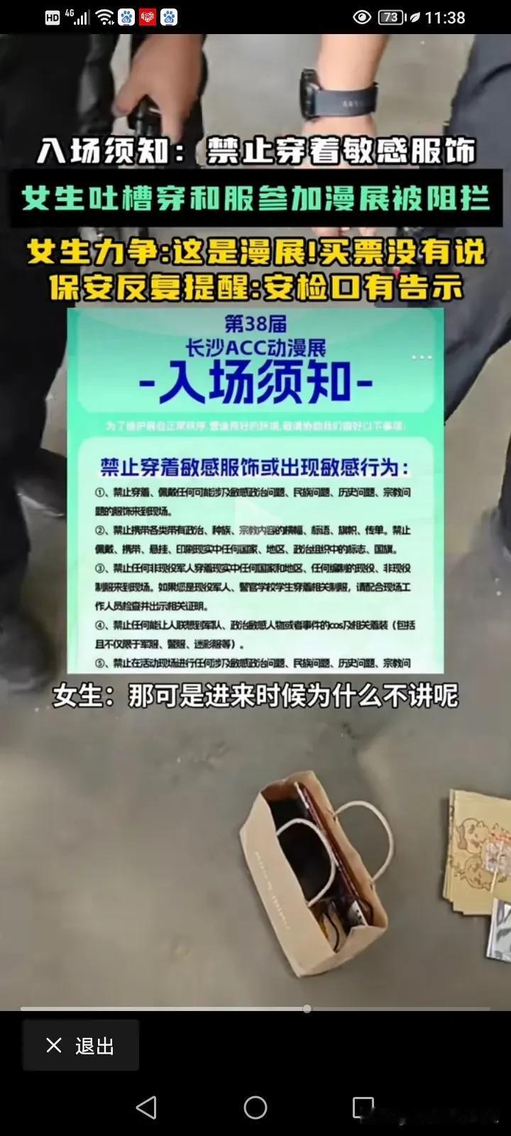 湖南长沙,一个漫展,一名女子和朋友在门口被多名保安阻拦,女子据理力争的说我们是买了票的,为什么不让我们进?保安说你们穿成这样子,不合适,我们这里不让穿和服。 女子说这是我们打扮的角色,这里是漫展,那是不是就不让进去了? 保安说,没有说不让你进去,只是不能穿和服进去,不合适,我们门口都有告示的! 女子委屈的说,那我们买票的时候,他们也不说呀! 其实没必要为难保安,保安也是按上头下达的命令来执行而已,而且告示也说的明明白白的,这些敏感的着装还是少穿为好,年纪轻轻的,不要以这样的装扮搞另类吸引流量和博眼球。 勿忘国耻,防止文化入侵,打击亵渎中华民族行为,我觉得保安的做法没问题,我也觉得主办方的三观很正,反而是现在的年轻人想法太多! #记录我的2024#