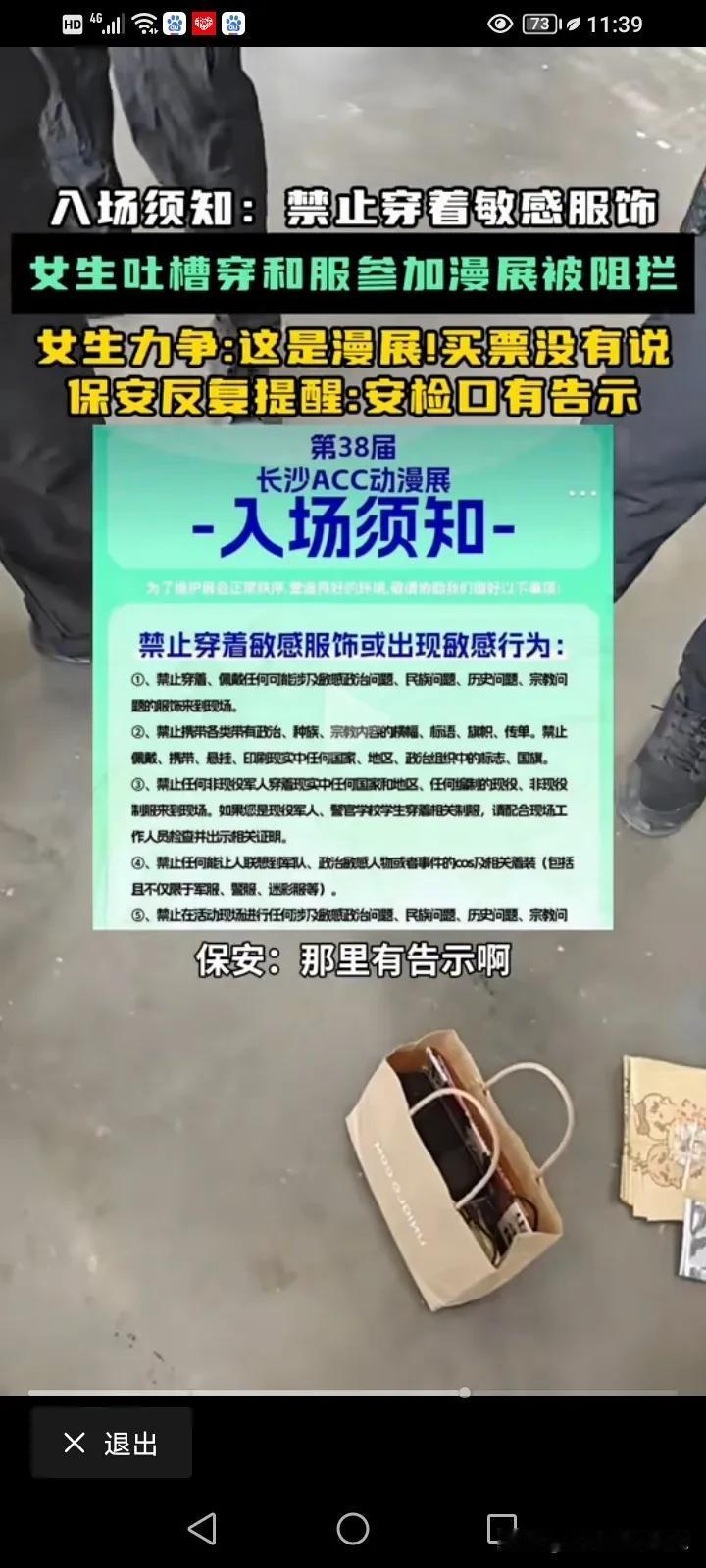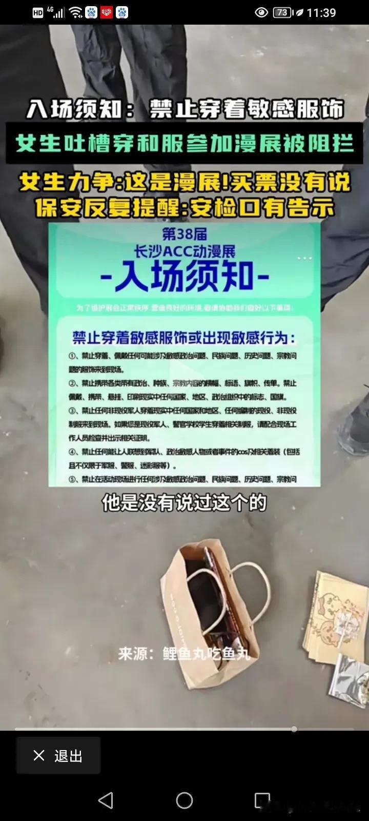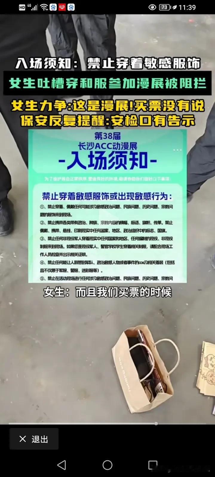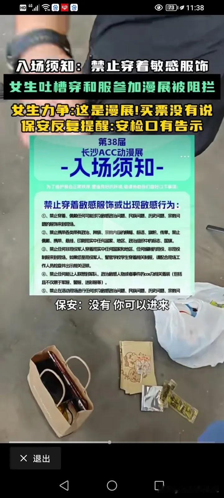 湖南长沙,一个漫展,一名女子和朋友在门口被多名保安阻拦,女子据理力争的说我们是买了票的,为什么不让我们进?保安说你们穿成这样子,不合适,我们这里不让穿和服。 女子说这是我们打扮的角色,这里是漫展,那是不是就不让进去了? 保安说,没有说不让你进去,只是不能穿和服进去,不合适,我们门口都有告示的! 女子委屈的说,那我们买票的时候,他们也不说呀! 其实没必要为难保安,保安也是按上头下达的命令来执行而已,而且告示也说的明明白白的,这些敏感的着装还是少穿为好,年纪轻轻的,不要以这样的装扮搞另类吸引流量和博眼球。 勿忘国耻,防止文化入侵,打击亵渎中华民族行为,我觉得保安的做法没问题,我也觉得主办方的三观很正,反而是现在的年轻人想法太多! #记录我的2024#