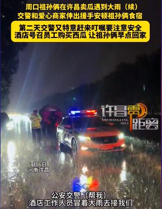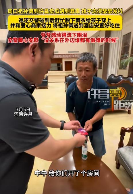 泪奔了!周口祖孙俩到许昌卖西瓜,突然下暴雨。爷爷无奈用塑料棚盖住西瓜,和小孙子在大雨中瑟瑟发抖,没想到交警来查车。爷爷原以为自己要被罚款了,没想到交警的做法却让他感动不已。 (信源:周口祖孙俩在许昌卖瓜遇到暴雨,交警和爱心商家接力——许昌零距离) 今年天气实在是有点极端,自从过年以来,南方有些地方下雨就没停过,家里受潮特别严重,让人叫苦连天,可北方一些地方却几乎没见过雨水,就比如河南。 虽说偶尔天气预报上说有雨,可基本上是下不来。一晃半年时间过去,终于在七月份迎来了雨水,只是没想到备受农民伯伯期盼的雨水竟然不经意间阻挡了有些人回家的路。 7月5日,在许昌街头,一老一小祖孙两人拉着一车西瓜停了下来。他们是从周口过来的,希望在许昌能卖个好价钱。 只是到的稍微晚了点,没赶上人最多的时候,因此西瓜没有卖出去多少。 但这也没关系,这本就在大爷的意料之中。出来卖西瓜,在这里一呆就是几天并算不得什么,反正是夏天,在外面睡觉对他来说也不是什么大事,只是有点苦了小孙子。 原本出来卖西瓜是不该带着小孩的,只是因为孩子放暑假了,年纪又小,而儿子又去外地打工挣钱了,家里没人能照顾小孙子,所以大爷也是不得已才带着他出来了。 不过这样也好,让小小男子汉看看挣钱有多么地不容易,以后就会好好学习了。 只是,大爷看着渐渐阴沉下来的天气陷入了沉思,似乎有些不凑巧,看起来有点想下雨。 原本大爷还抱着侥幸的心理,毕竟今年阴天不下雨的情况并不少见,可没想到很快雨点就劈里啪啦地落了下来。 见此,大爷首先要保住的就是那一车西瓜,毕竟这可是吃饭的家伙。因此着急忙慌地将叠好的塑料膜展开,将它铺在了西瓜的上面,随后牢牢地固定在了车上。 确保西瓜不会被淋湿后,又赶紧拿出了雨衣,给自己和小孙子穿上。看着这么大的雨,大爷无比希望这只是个阵雨,下一会儿就停了,可雨却越下越大。 祖孙俩一时有些不知所措,想找个宾馆躲躲吧,价格又贵,关键是西瓜也没人看了,害怕会被人拿走。 就在祖孙俩一筹莫展之际,交警叔叔停在了他们的身边。大爷心中一惊,西瓜车停在这里,恐怕是占道经营了,可能得被罚款。 他有些不好意思地看着交警,却不曾想交警让小孩坐上了警车,而后让大爷开车跟自己走。 在交警的带领下,祖孙俩来到了许昌航空大酒店。而酒店工作人员见此,连忙给两人安排了住宿和饮食,都是免费的。 雨过天晴,第二天,看着大爷的一车西瓜,酒店当机立断买下来了不少,而酒店工作人员和民警们也纷纷前来购买,很快就把大爷的一车西瓜给瓜分干净了。还有人拿来了自家小孩的衣服,让小孙子先换上干净的衣服。 而面对采访,大爷高兴地说,没住过这么好的酒店,吃的还是自助餐。 而酒店工作人员表示,都知道胖东来服务态度好,自己也是向他们学习一下,而且自己作为国企酒店,做点好事也是应该的。 不得不说,我们的社会真是越来越好了。