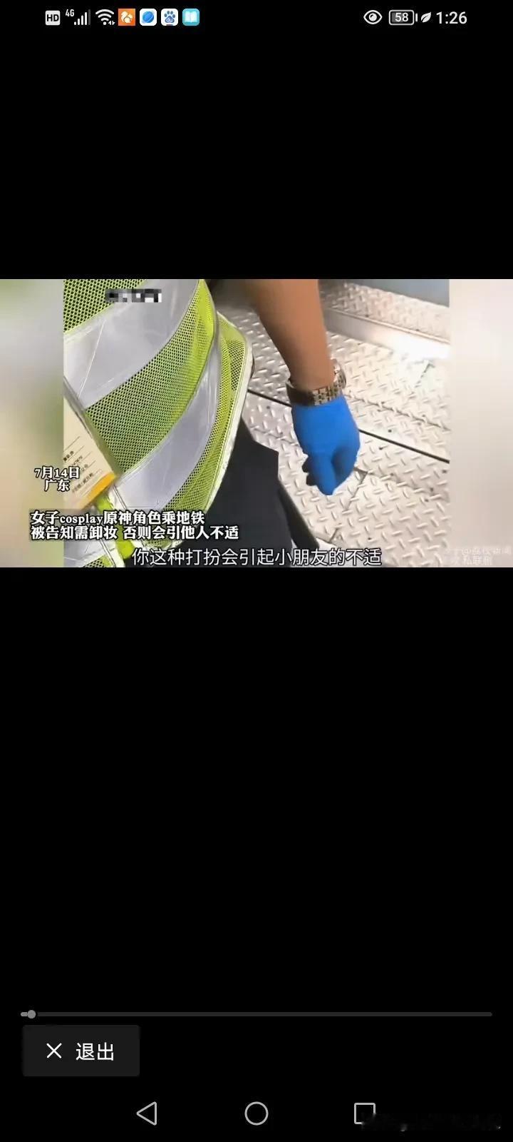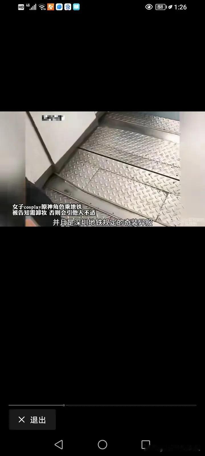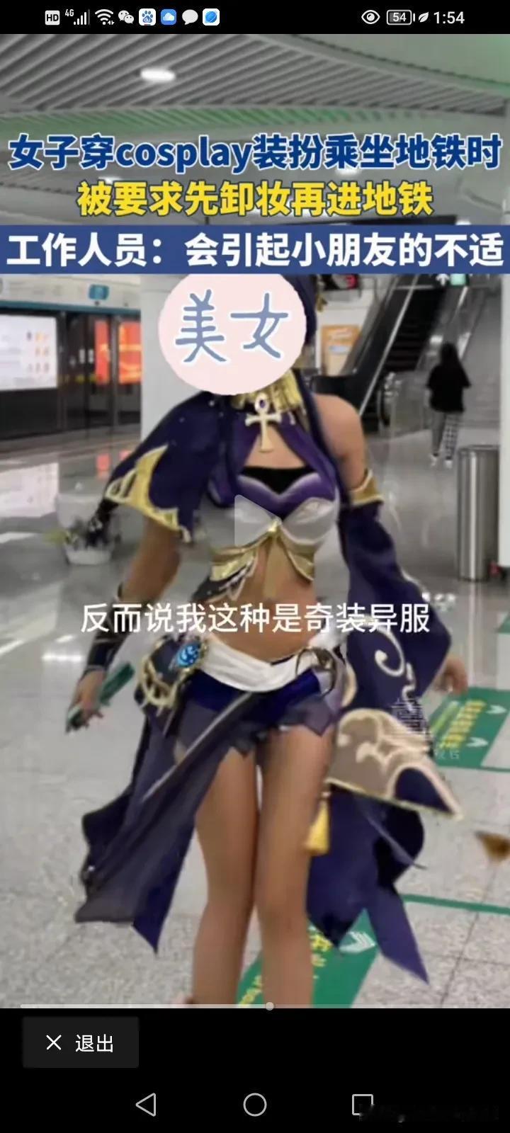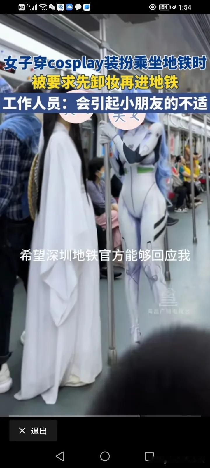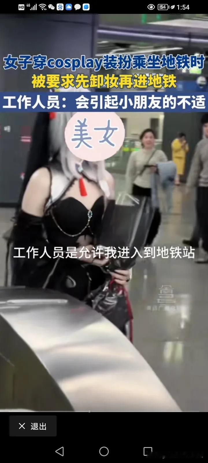 女子cosplay游戏角色乘坐深圳地铁被工作人员要求她卸妆,并且说奇装异服要放背包内,不然会吓到小朋友!很多人没有看到女子当天的装扮,如果你们看到她当天的装扮,我相信大部分人都会支持深圳地铁的做法! 女子在深圳北站上地铁,一位工作人员跟他说:“你的这种装扮会引起小朋友的不适,请你以后上地铁卸妆,这是我的原话!” 对此,Coser不服,特意让工作人员重复上述的那些话,然后拍了个视频并大声喊话深圳地铁:“深圳地铁是否有这样的规定?” 女子认为既然深圳每年都举行动漫展,那穿奇装异服上地铁这种行为必须应该被理解才行。希望得到深圳地铁官方回应。 对于女子这样的行为,有人表示,现在是法治社会,法无禁止皆可为!深圳地铁工作人员没有执法权,不能打着吓唬小朋友的旗号去剥夺其他人的利益,每个人都有自己的装扮权和乘坐公共交通的权益。 深圳官方给出了回应:确实不能穿着奇装异服乘车,会倡导乘客卸妆出行,相关的cosplay物品经过安全检测,放入背包内。 对于这件事情,我是这么看的,我一开始以为这女的装扮是卡哇伊,很可爱的那种,以为是大家都可以接受的那种,但是当我看到这名女子当日的装扮,特别是她画的眼妆,别说小朋友了,我一个大人,我也吓一跳,如果老人有心脏病的被吓了,后果怎么样呢? 我觉得这种服装就应该自己打的士,确实不适合坐地铁公交,特别有些化妆特别血腥,乌漆麻黑,满脸獠牙的,穿着暴露的,在公共地区,这样奇装异服,无非就是让更多人去关注你而已,如果你去表演,那行,那请你在指定的表演区里面穿上那无可厚非,这种事情最好就是到提前动漫展的现场去画,真的没必要这么张扬,我尊重二次元,但我觉得也需要尊重他人! 备注第一张图是女子当天的装扮!最后那几张是其他人的装扮。 #记录我的2024#