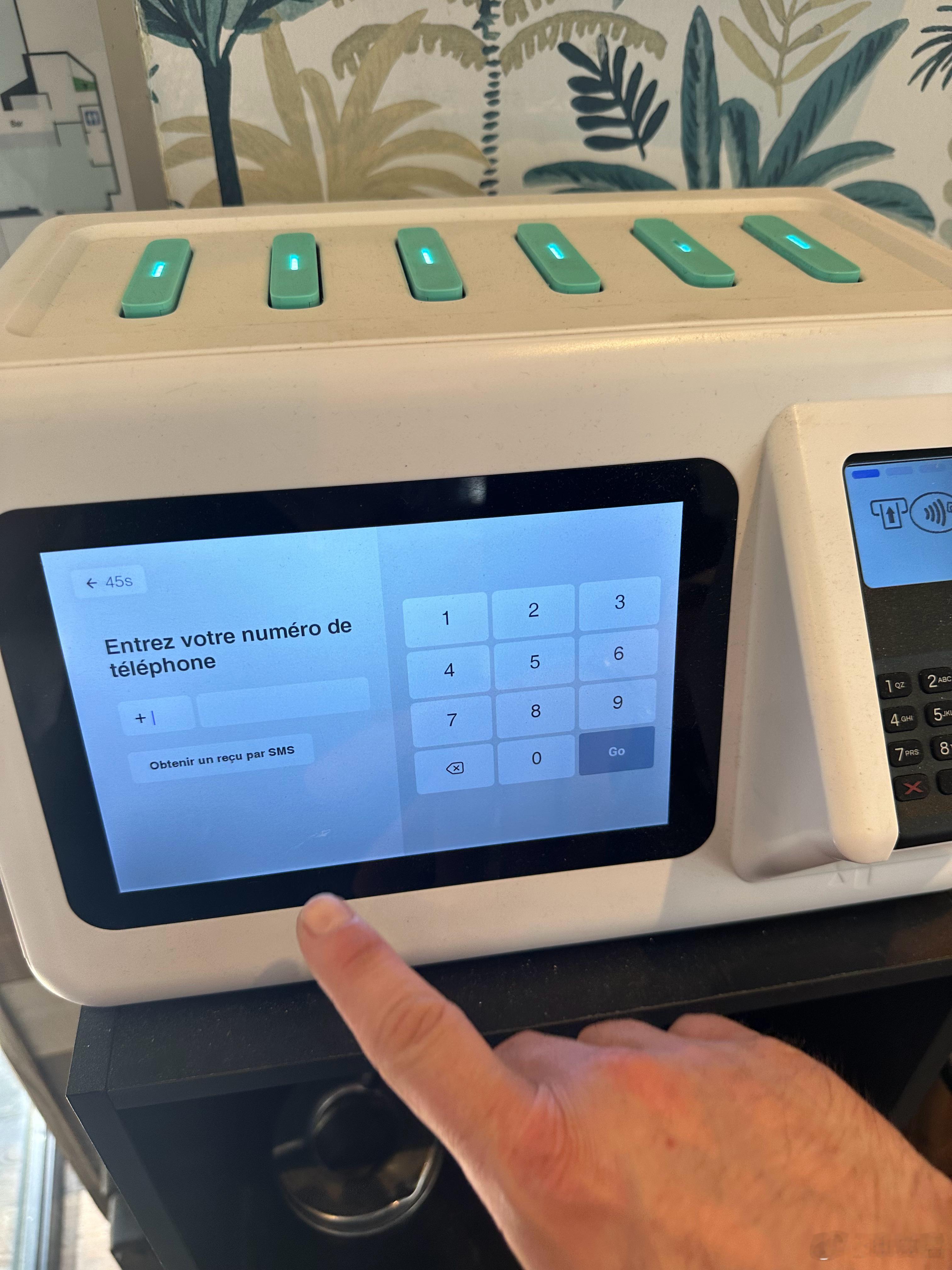 在巴黎的一个咖啡馆,不能充电,服务员指了指前面说,这里可以借充电宝,也没有表明任何价目,就用信用卡滴一下,就弹出一个充电宝。