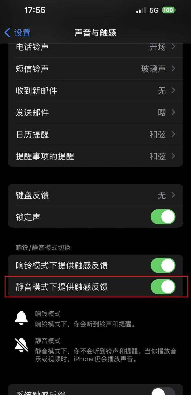 第三步:弹出的新页面中往下滑,找到“静音模式下提供触感反馈”,并将其选择选择关闭即可。