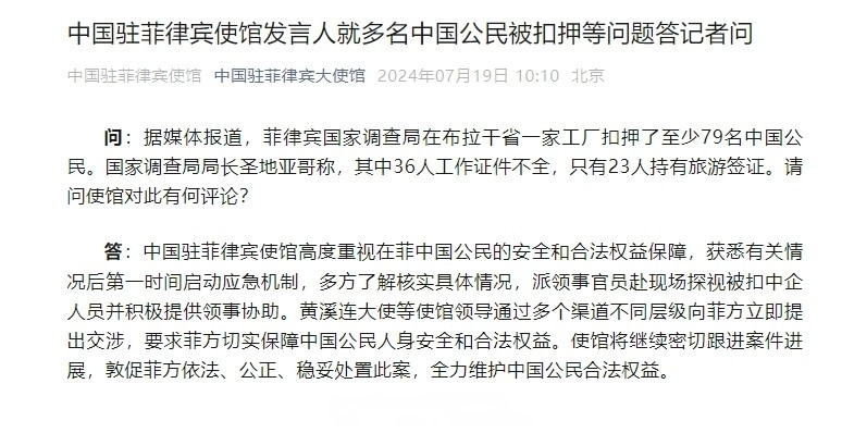 补给不成功,菲律宾拿中国公民开刀:扣押79人,中方严正交涉 7月19日,中国驻菲律宾大使馆发布声明,回应了菲律宾国家调查局在布拉干省圣扶西•黎•文地市一家工厂扣留至少79名中国公民的事件。声明中指出,使馆已派员探访被扣留人员,并向菲律宾方面提出交涉,要求菲方依法公正处理案件,保障中国公民的合法权益。 这事是菲律宾国家调查局在布拉干省圣扶西•黎•文地市一家工厂干的,把人抓了带到他们在奎松市的总部。菲律宾调查局说,这79个人里面有36个啥手续都没有,还有23个只有旅游签证。但他们没说更多细节。 这事儿发生在菲律宾一个月没能在仁爱礁补给成功的当口,他们突然扣咱们79个人,这让人难免多想。现在看大使馆的说法,这些人可能就是工厂里干活的,不是干啥违法勾当的。这不像菲律宾跟咱们提前商量好的联合行动,所以可能他们是想趁机抓在菲律宾的中国人。 中国人在菲律宾老是被绑架,菲律宾那边没啥反应;但对在那儿打工的中国人,他们却下手狠。他们这是啥心思,昭然若揭!