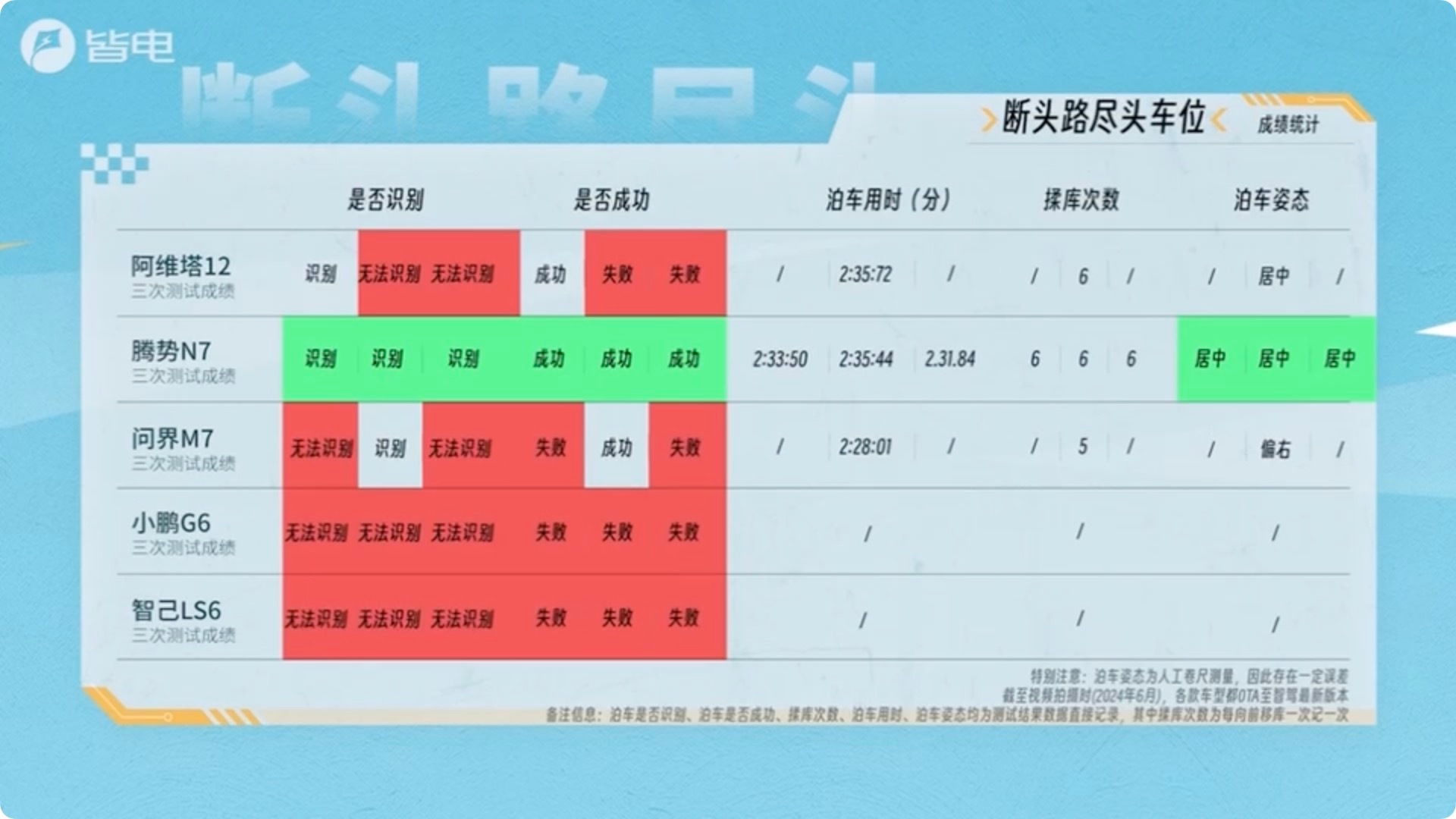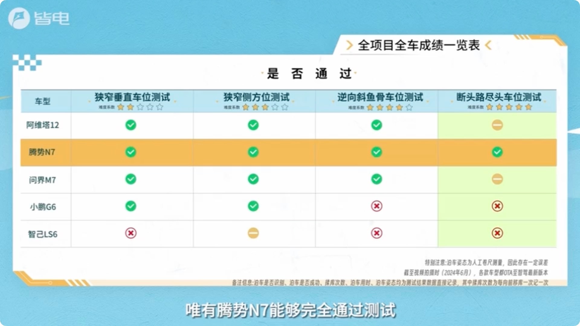 刚刚看了皆电2024自动泊车评测的视频,成绩挺让我惊讶的,完成全部测试的竟然只有腾势N7,除了泊车速度稍逊于阿维塔12,其他成绩都非常不错,我个人非常讨厌的狭长侧方位和断头路尽头车位的也停的很是流畅,采用的都是掉头泊入,而且计算的非常果断,比亚迪自动泊车表现惊艳,确实让人放心。
