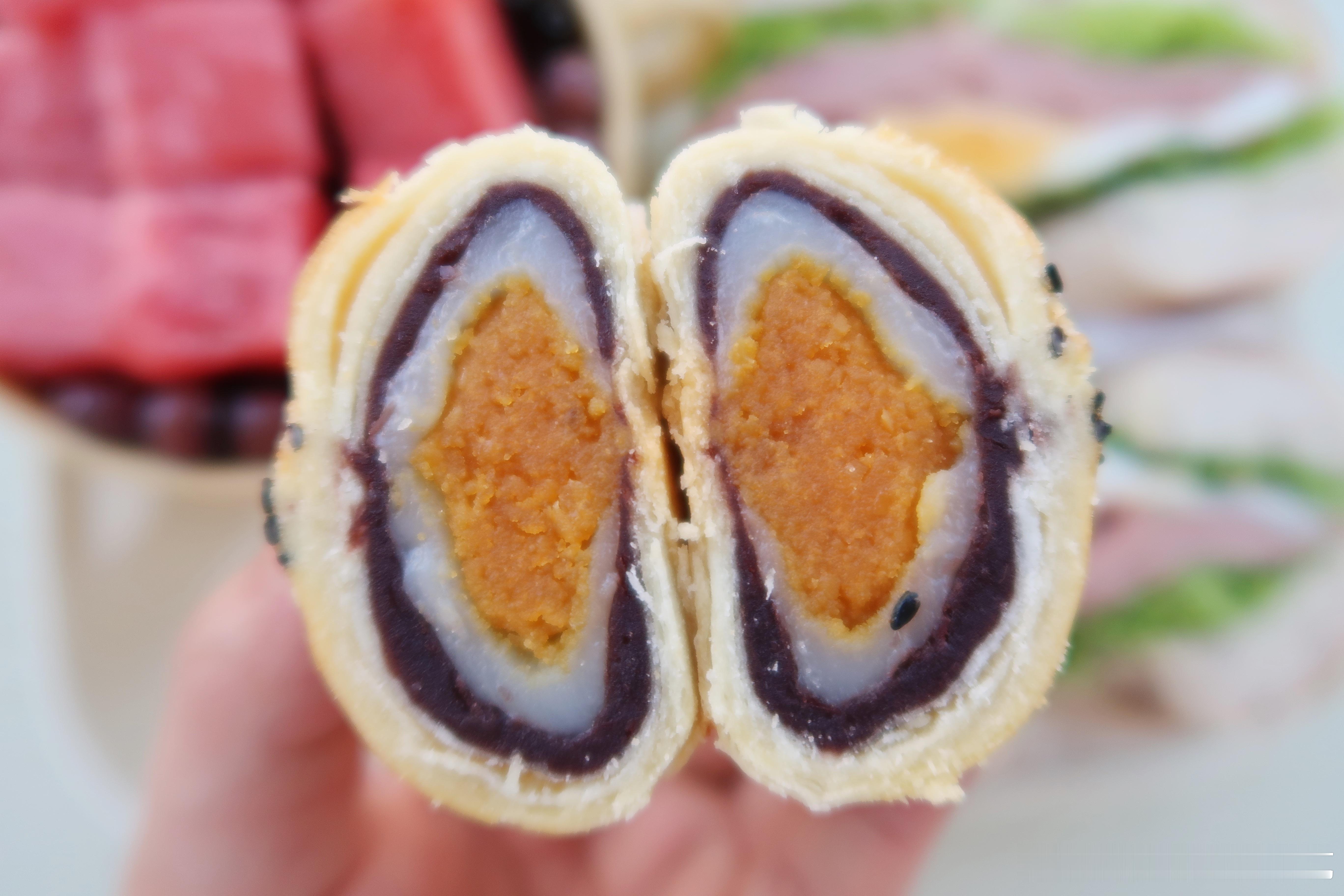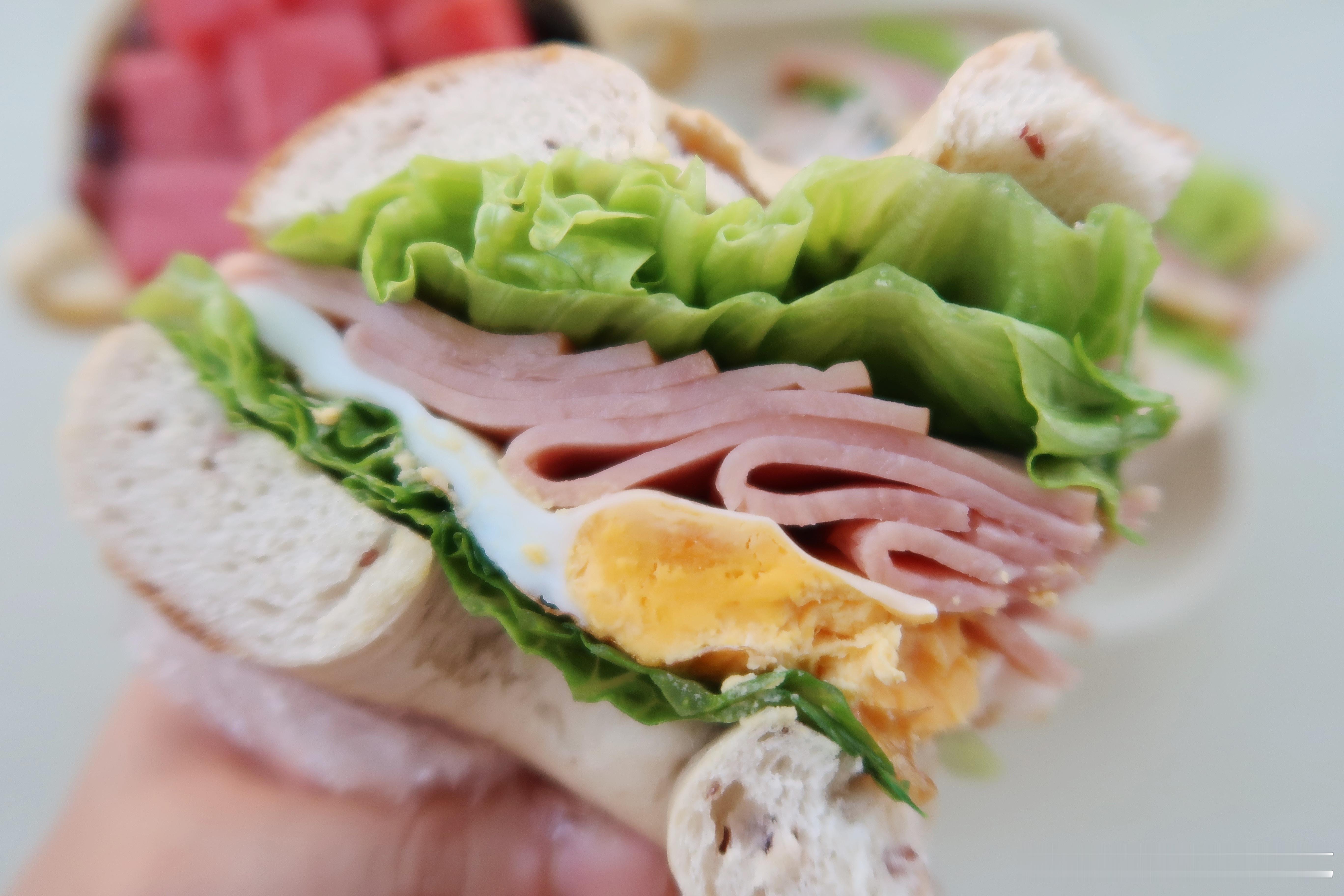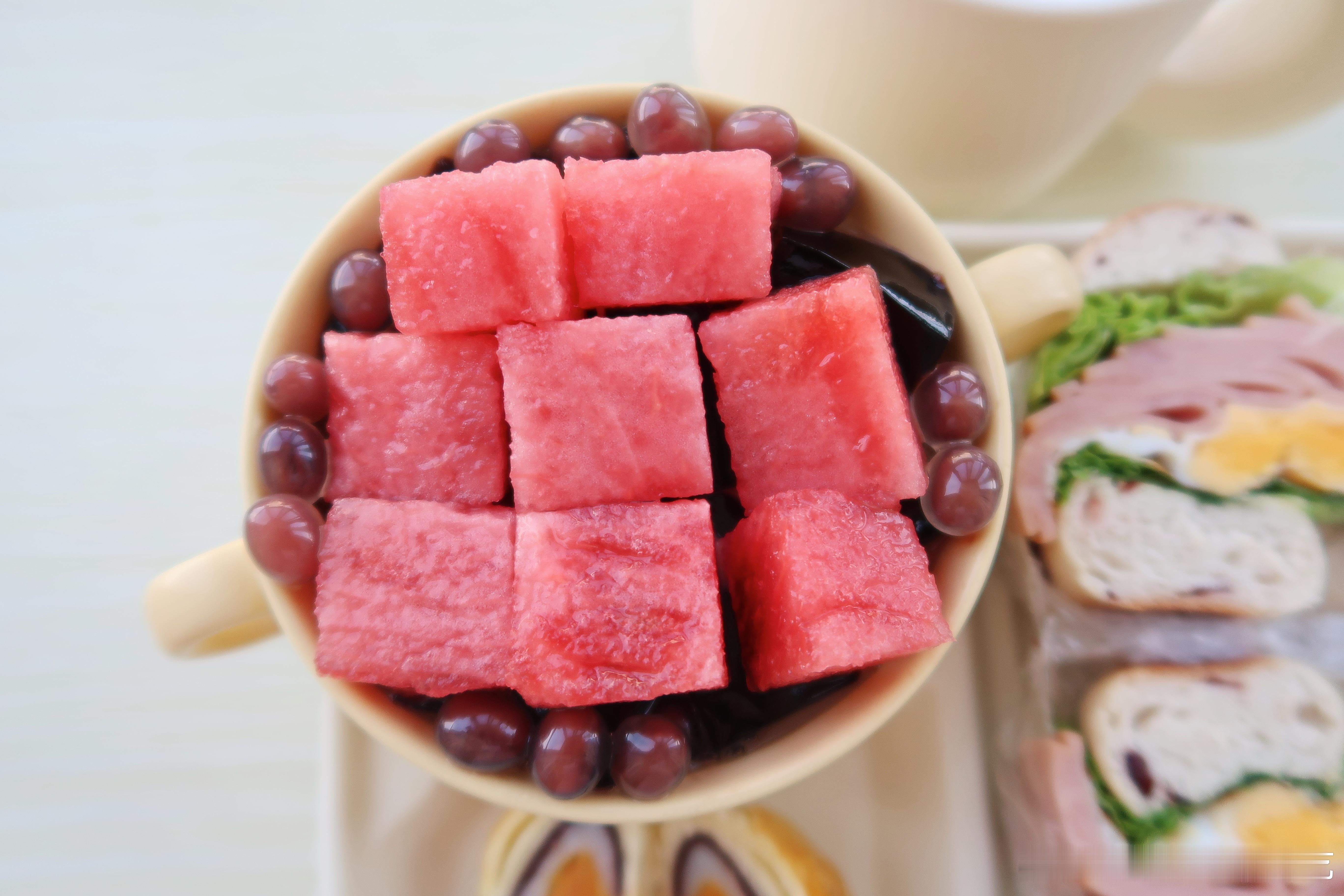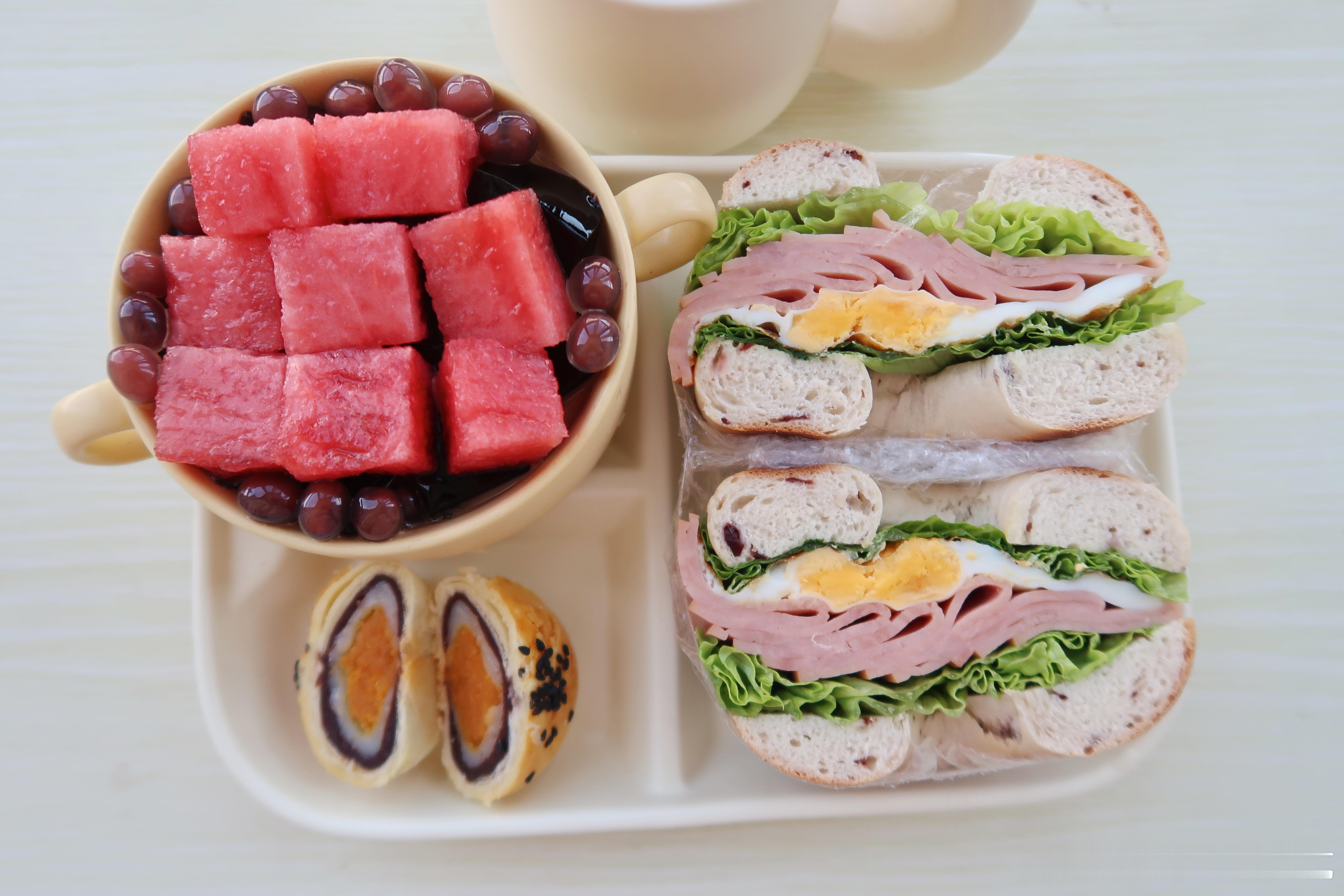 周末早.今天的早餐是火腿鸡蛋贝果🥯西瓜烧仙草🍉蛋黄酥🍪牛奶🥛
