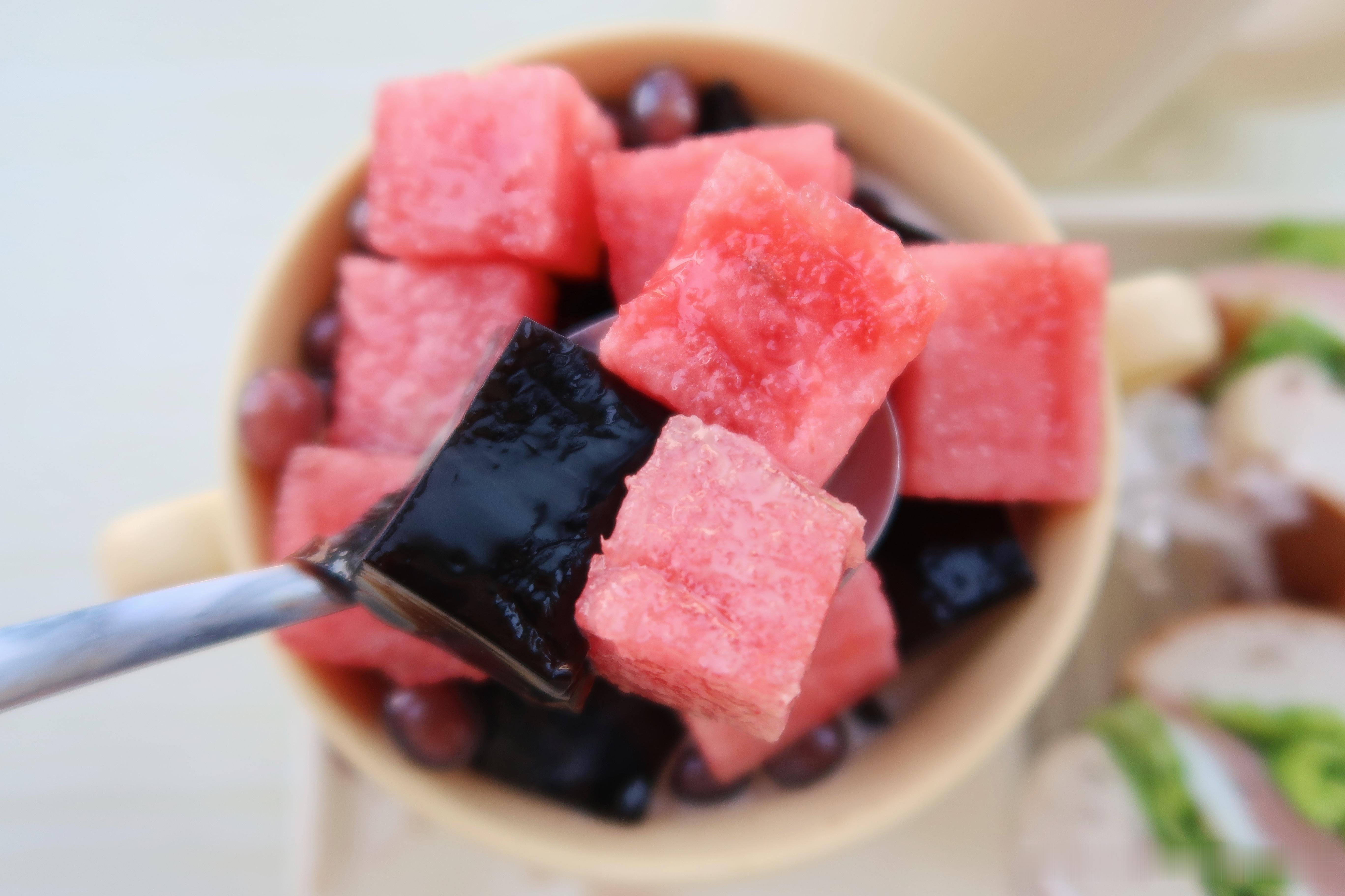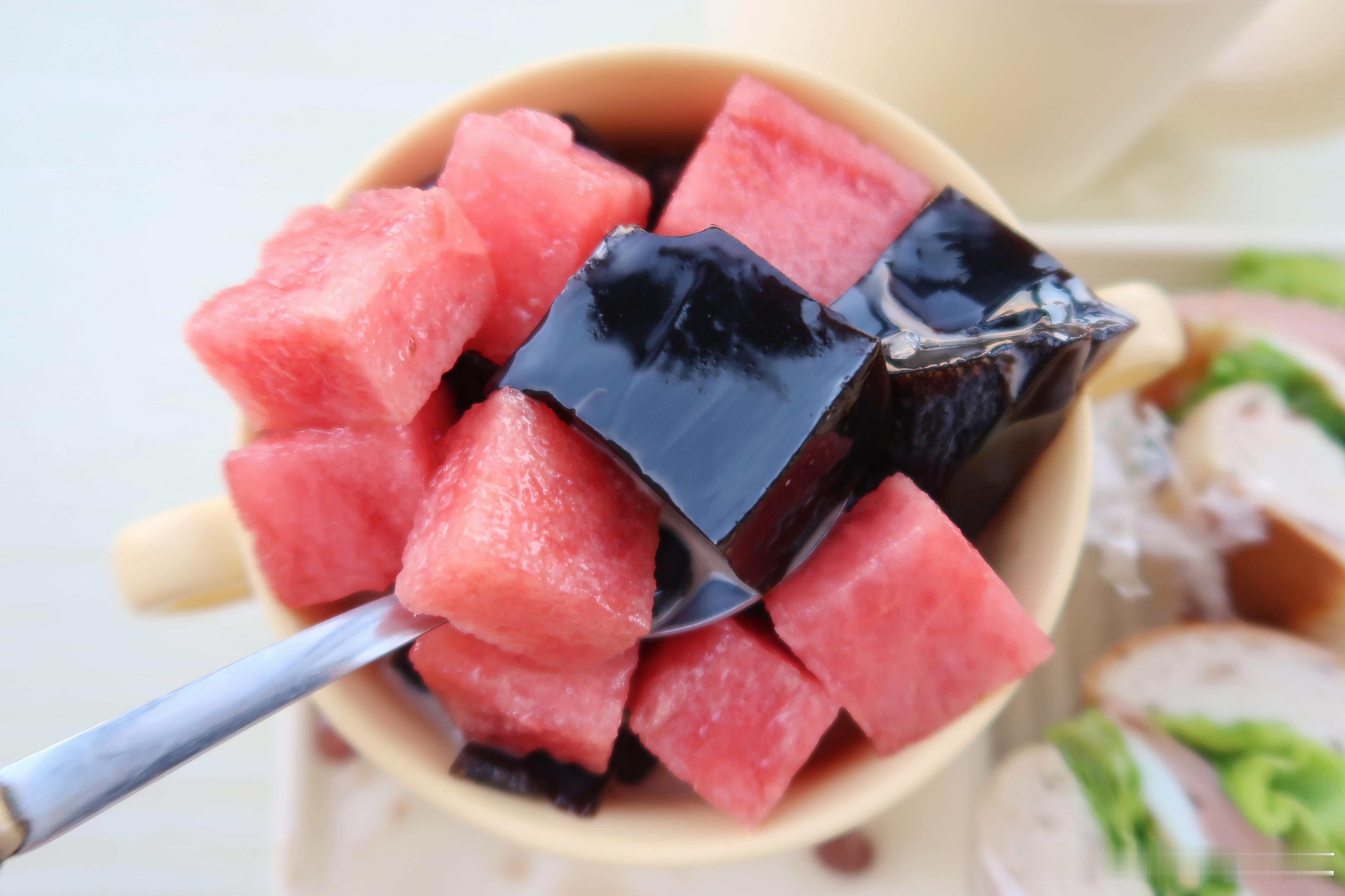 做了西瓜烧仙草,天气热了每天都想吃清凉解暑的小甜品,晚上做好烧仙草早上放上水果芋圆红豆,加上牛奶,都特别好吃.