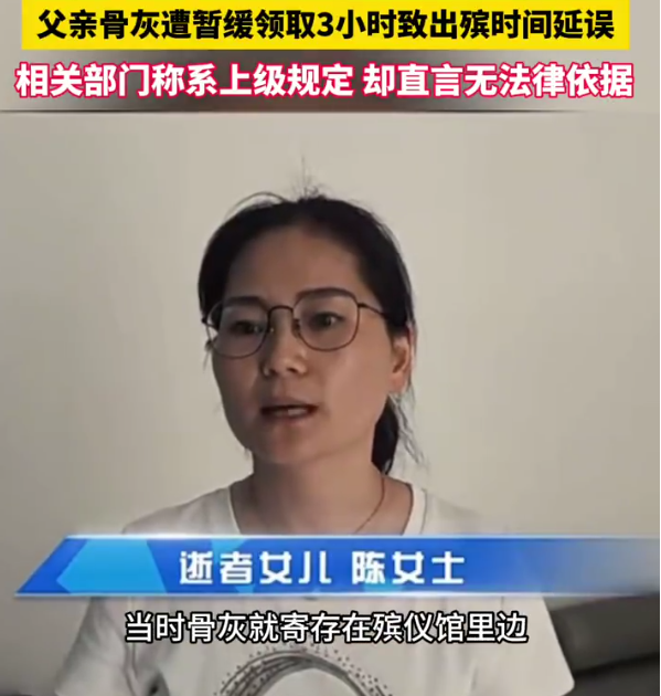 7 月 14 号早上六点,陈女士一家人准备领取父亲骨灰去埋葬,却被告知因违反规章制度,骨灰要被扣留三小时,对方称是听从村里领导安排。陈女士焦急又无奈,定好的下葬时间就这样错过了。