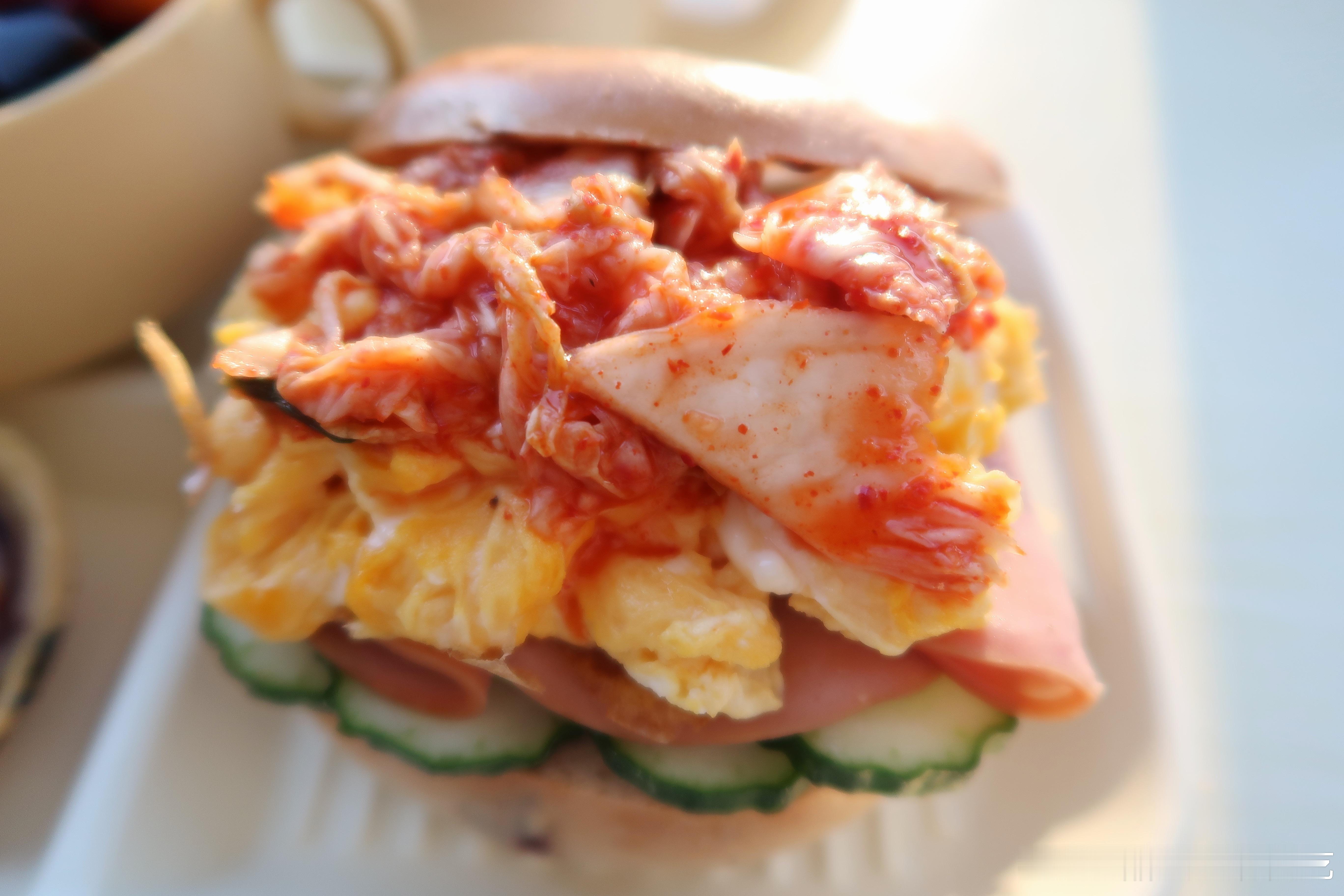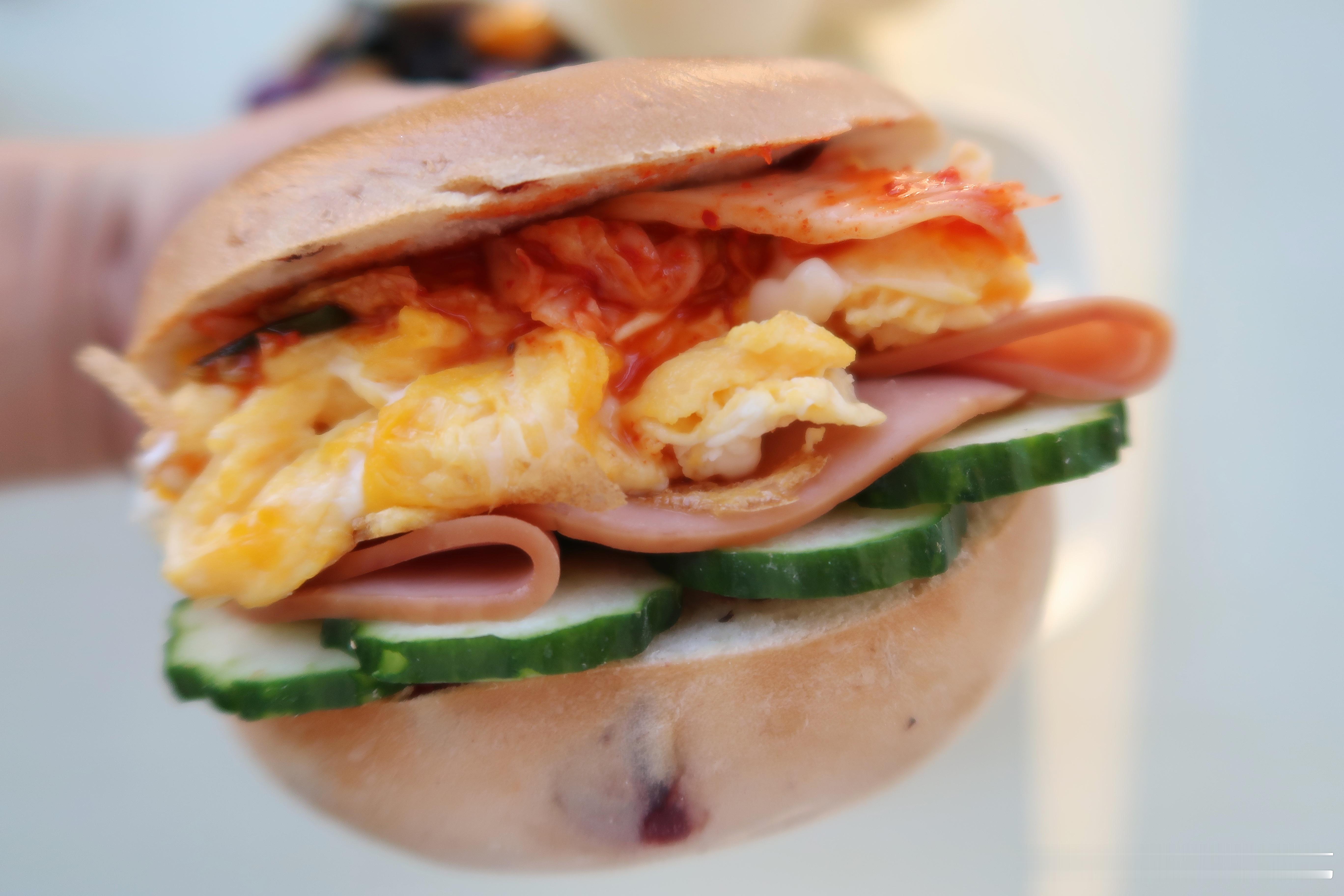 今天吃泡菜滑蛋贝果,贝果空气炸锅复烤,码放上黄瓜片、火腿片、滑蛋和泡菜,泡菜酸酸辣辣的,整体是很开胃的口感.
