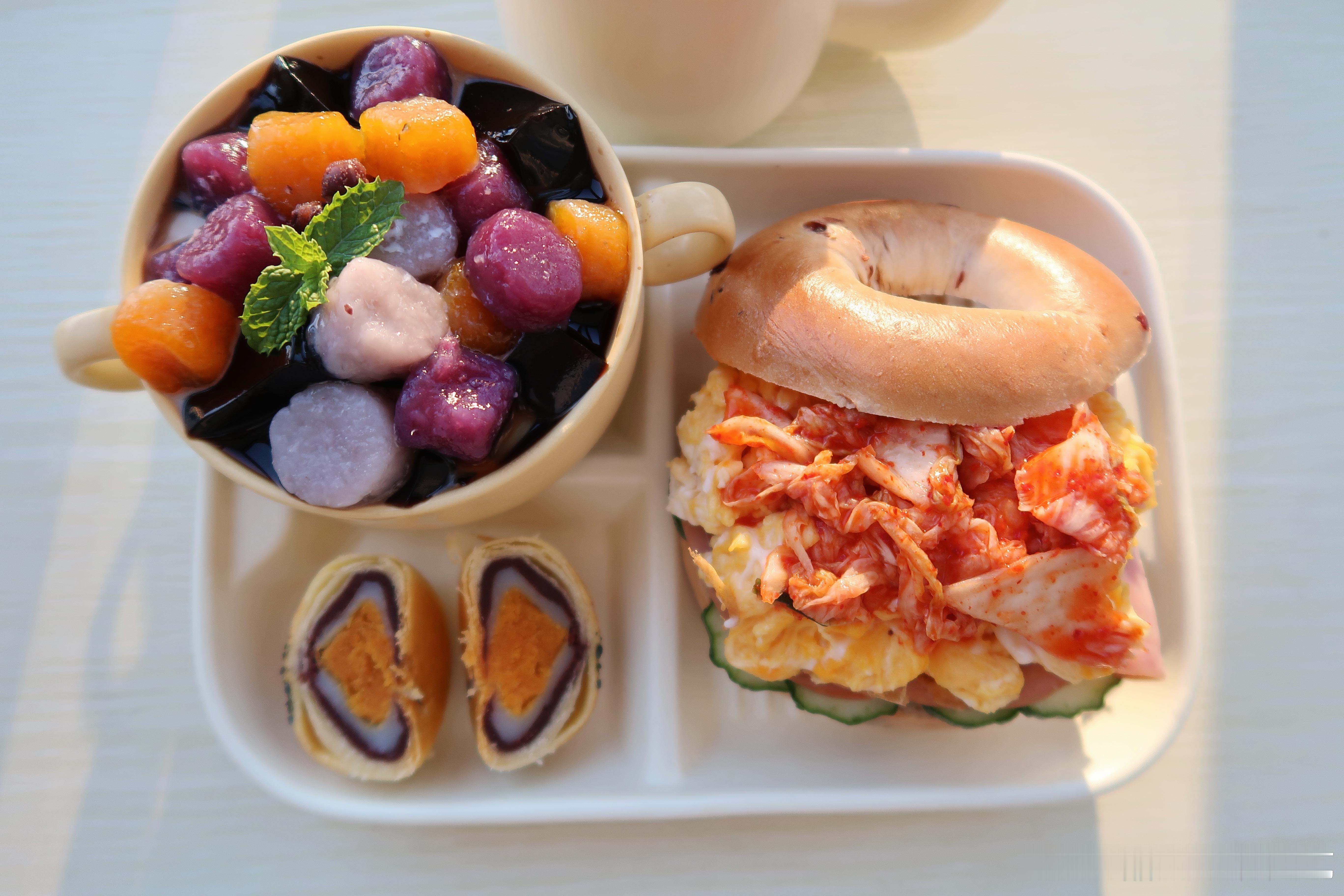 早.今天的早餐是泡菜滑蛋贝果🥯芋圆烧仙草🍧蛋黄酥🍪咖啡☕️