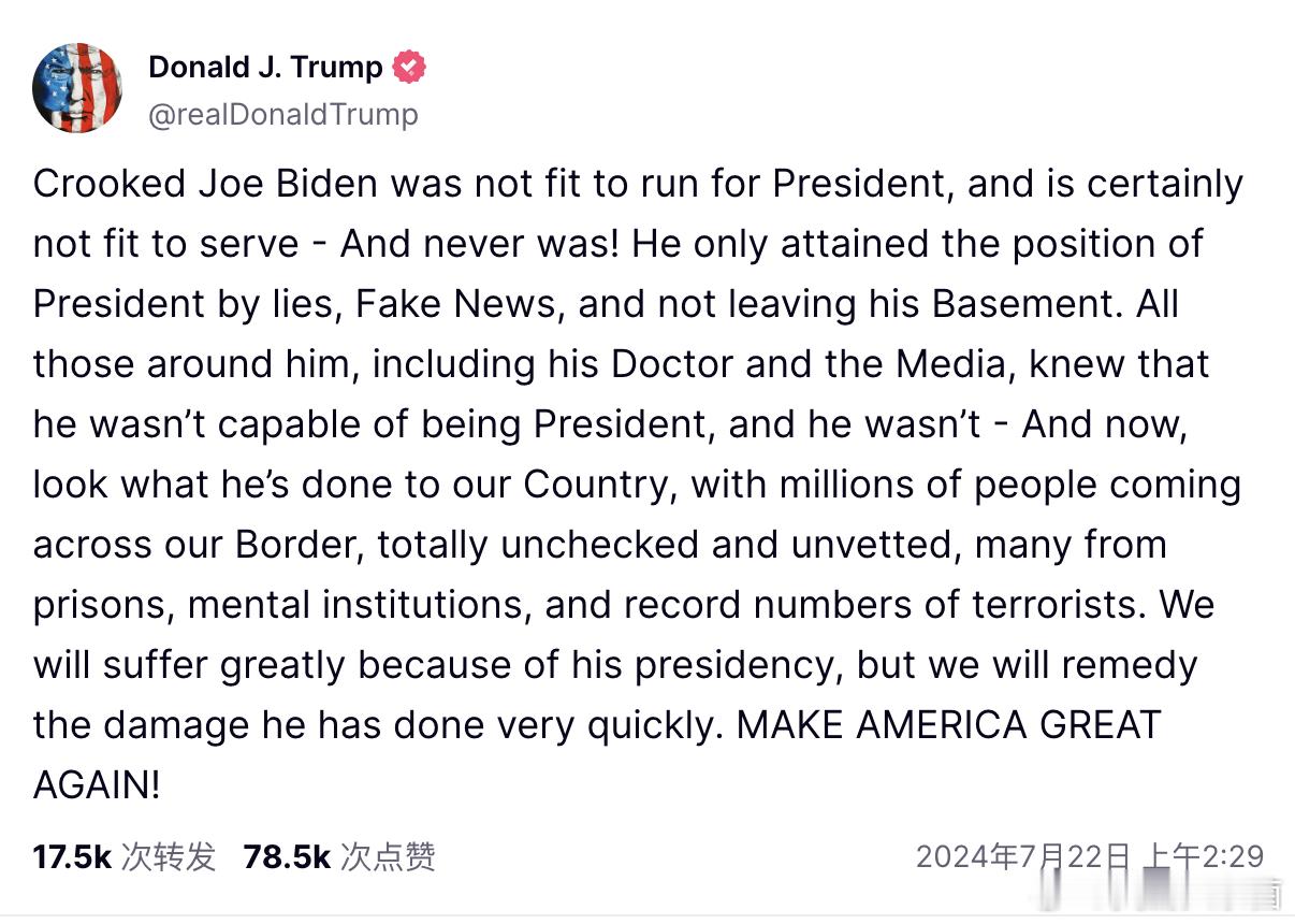 「歪曲事实的乔-拜登不适合竞选总统,当然也不适合担任总统,而且从来就不适合!他是靠谎言、假新闻和不离开地下室才当上总统的。他身边的所有人,包括他的医生和媒体,都知道他没有能力当总统,他确实不适合。而现在,看看他对我们的国家做了什么,数百万人越过我们的边境,完全没有经过检查和审查,许多人来自监狱、精神病院,恐怖分子的数量也创了纪录。我们会因为他的总统任期而遭受巨大损失,但我们会很快弥补他造成的损失。让美国再次伟大!」