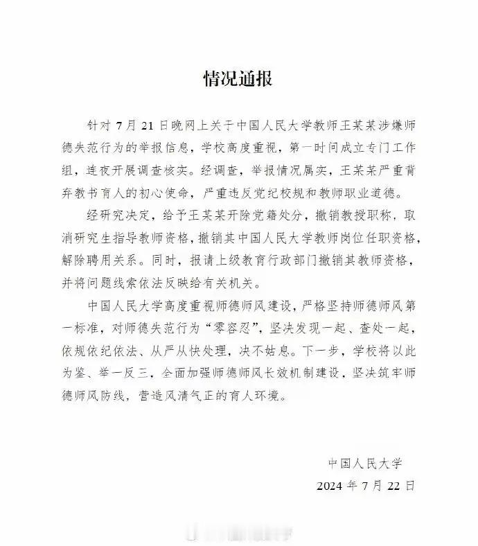 7月21日晚,网络上流传着关于中国人民大学教师王某某涉嫌师德失范行为的举报信息。此消息迅速引发了社会各界的广泛关注和热议,对我校的声誉和形象造成了严重影响。 面对这一突如其来的事件,中国人民大学高度重视,立即成立了由学校高层领导亲自挂帅的专门工作小组,全面启动调查核实工作。工作组由学校纪委、监察处、人事部等相关部门组成,他们具备丰富的调查经验和专业知识,能够确保调查工作的公正性和准确性。 在接下来的几天里,工作小组夜以继日地工作,他们仔细查阅了王某某的工作记录、学生评价、同事证言等大量资料,并与涉及事件的学生、家长和同事进行了深入的访谈。他们还邀请了外部专家参与调查,以确保调查结果的客观性和权威性。 经过连续几天的紧张工作,工作小组终于查明了事实真相。他们发现,王某某教师确实存在严重的师德失范行为,这些行为不仅违背了教师的职业道德规范,也严重损害了学生的利益和学校的声誉。 基于确凿的证据和对事实的全面了解,学校党委召开紧急会议,对王某某的行为进行了严肃讨论。经过充分讨论和审议,学校党委一致决定给予王某某开除党籍处分,撤销其教授职称,取消研究生指导教师资格,解除其在中国人民大学的教师岗位任职资格,并解除聘用关系。 同时,学校已向相关上级教育行政部门报告此事,并将依法反映给有关机关。学校还表示,将进一步加强师德师风建设,完善相关管理制度,确保类似事件不再发生。 这起事件的发生,不仅是对王某某个人的严厉惩罚,更是对整个教育界的警示。它提醒我们,作为一名教师,不仅要具备扎实的专业知识和教学能力,更要具备高尚的道德品质和良好的职业操守。师德师风是教师队伍建设的核心,是教育事业健康发展的基石。 对于学生和家长来说,这起事件也带来了深刻的教训。他们应该更加理性地看待网络上的各种信息,不要轻易相信未经证实的消息。同时,他们也应该积极参与学校的管理和监督,共同维护学校的声誉和形象。 对于中国人民大学来说,这起事件是一次严峻的考验,但也是一次难得的机遇。学校将以此次事件为契机,进一步加强师德师风建设,提高教师队伍的整体素质,为学生提供更好的教育环境和更高质量的教育资源。 我们坚信,在全校师生的共同努力下,中国人民大学一定能够度过难关,重新焕发生机和活力。我们也期待社会各界能够给予我们更多的支持和信任,共同推动中国高等教育事业的发展。