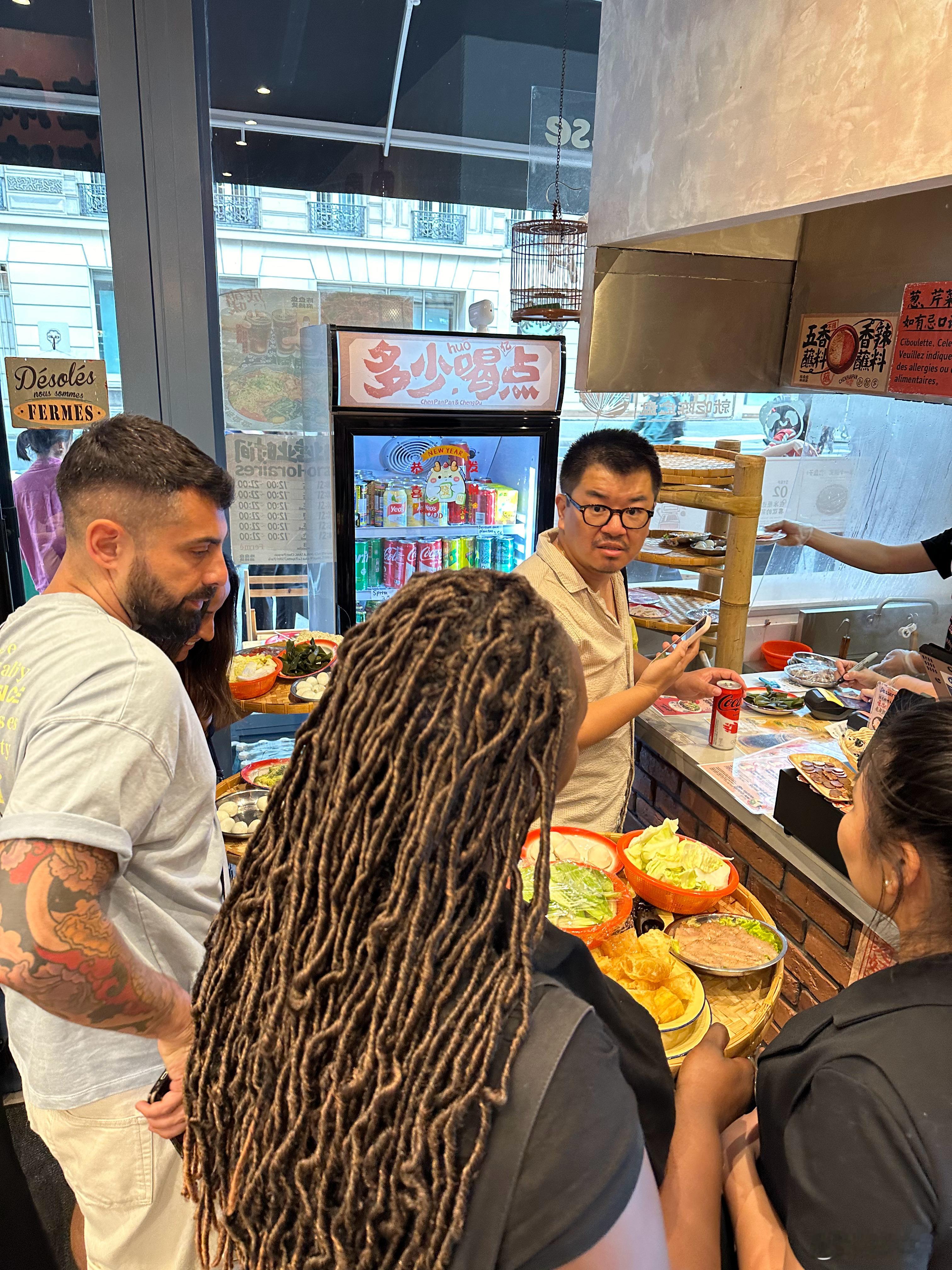 【图7~9】餐馆2,路过一家麻辣烫,味道特别香,就果断闯入,但是非常挤,所有顾客都拿着一个竹篮托盘,自己装菜。加个料的价格大概是人均20多欧。