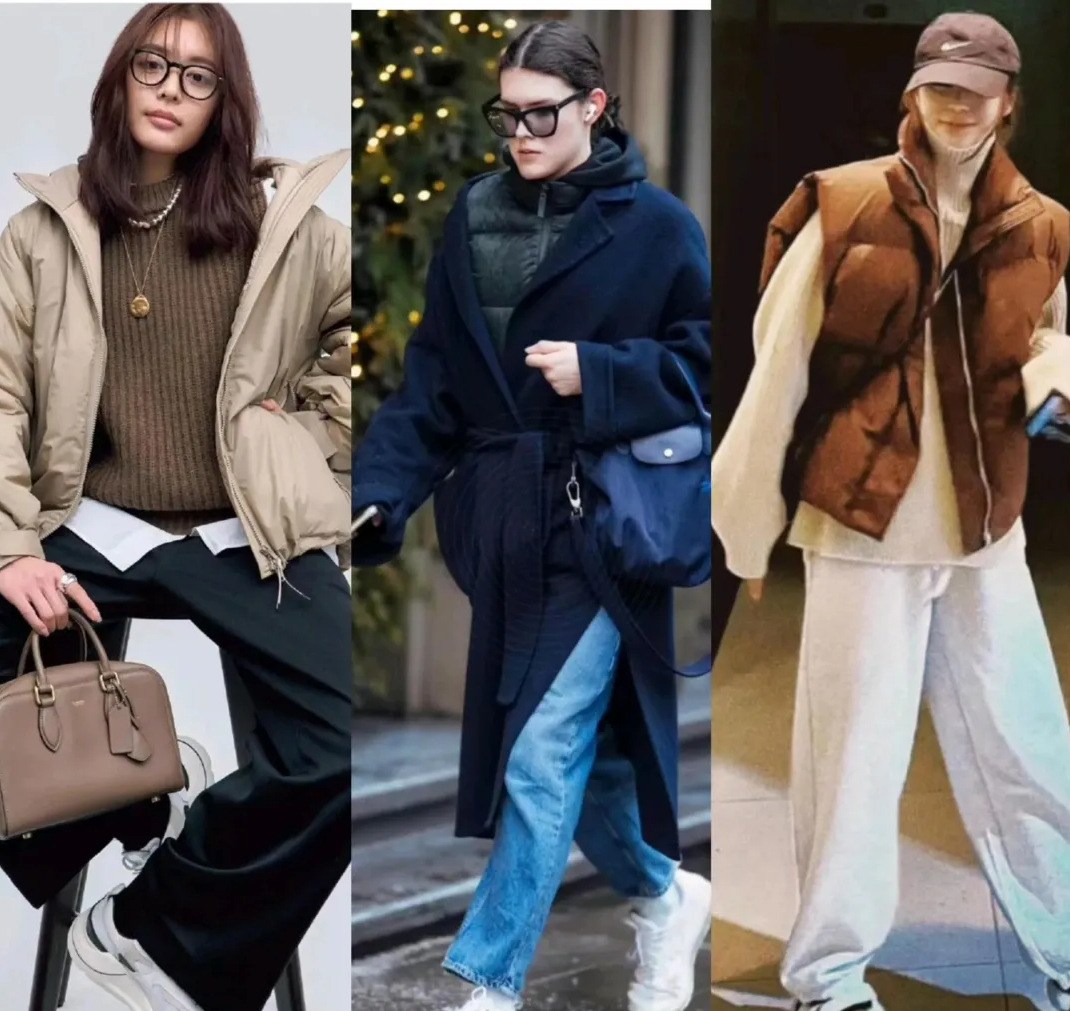 羽绒服+毛衣+衬衫是冬天最最流行的叠穿法了,三层的叠穿保暖性更好,不同材质、风格、颜色又可以穿出层次感,风格不同,造型会摆脱无趣,更时髦。