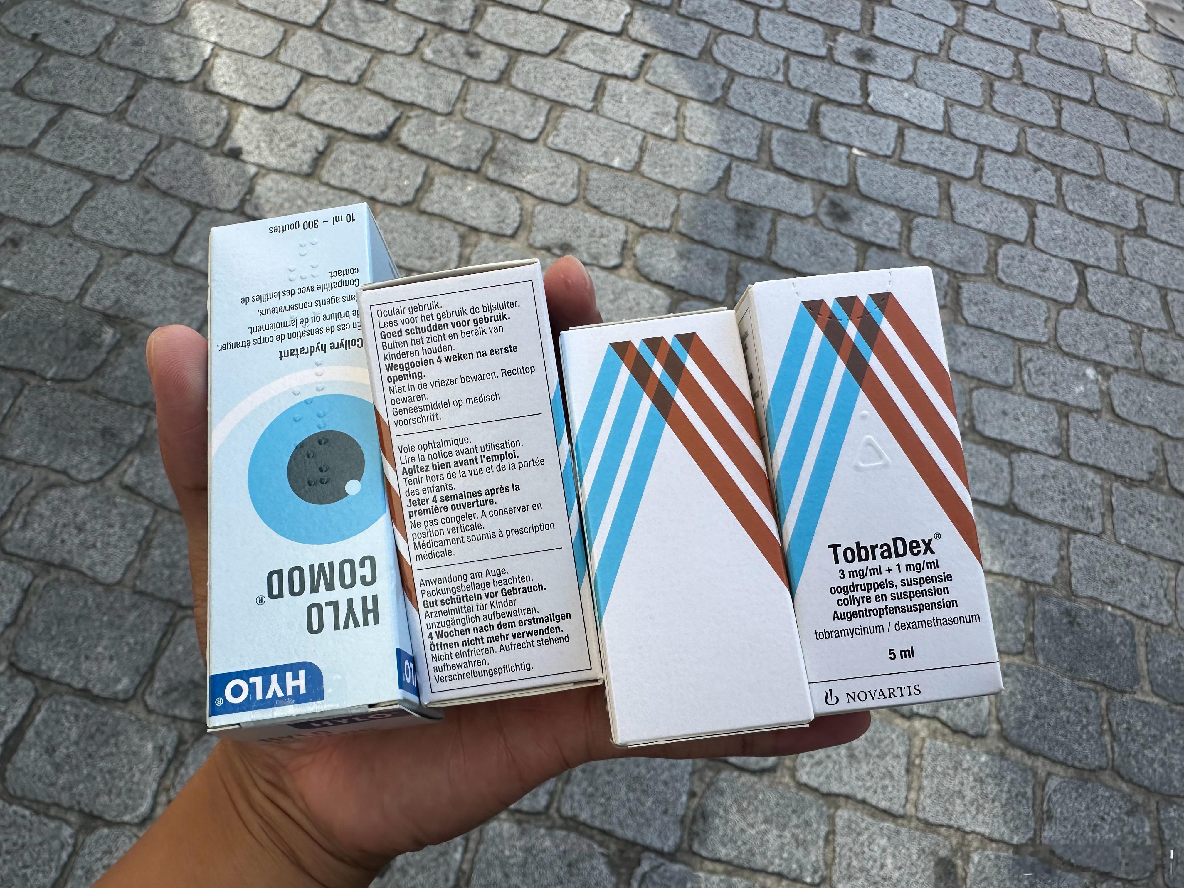 前阵子,我一直发牢骚说我在欧洲都买不到我要的眼药水【图2】右边这种消炎的眼药水,治疗角膜炎,眼睛发红的问题。