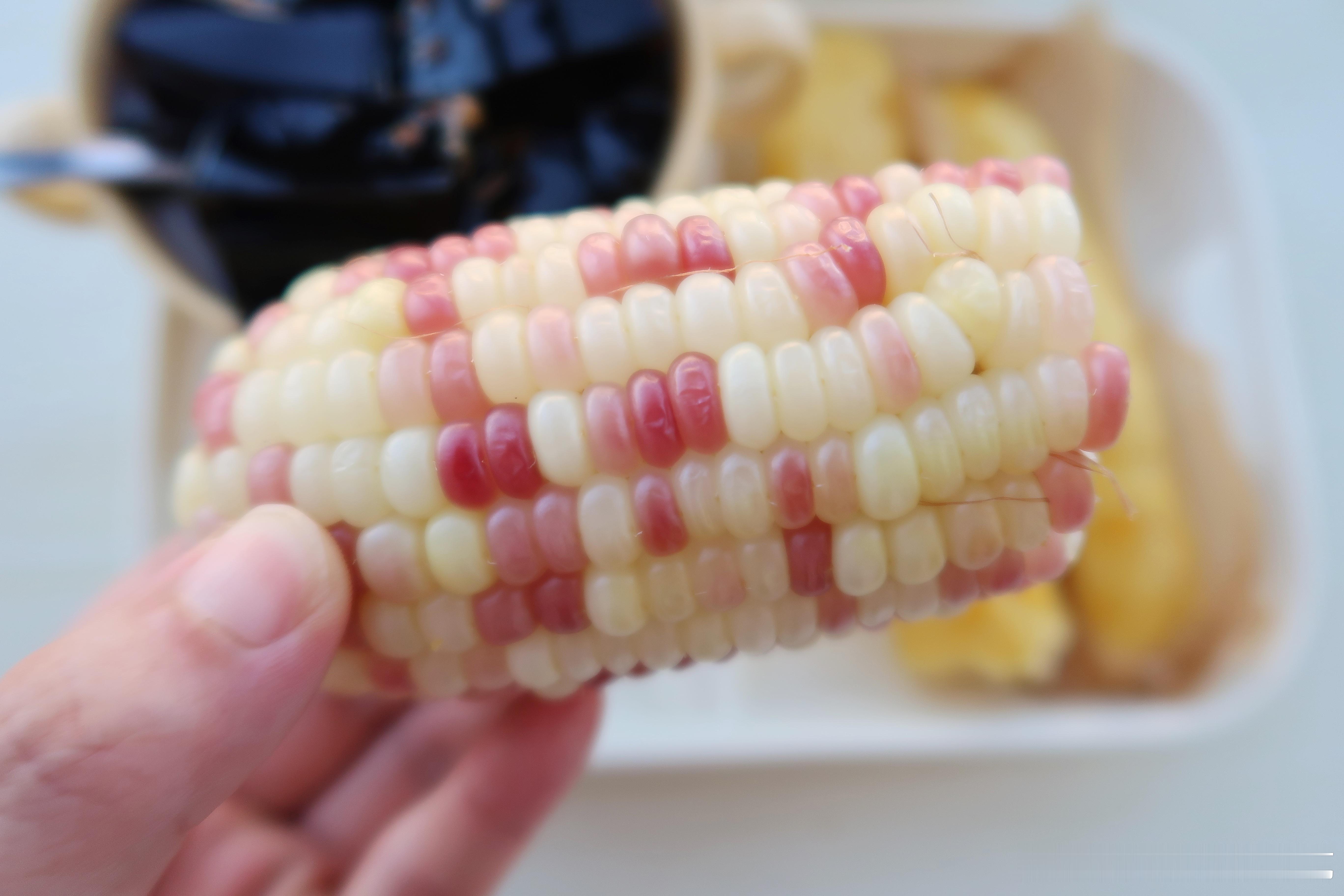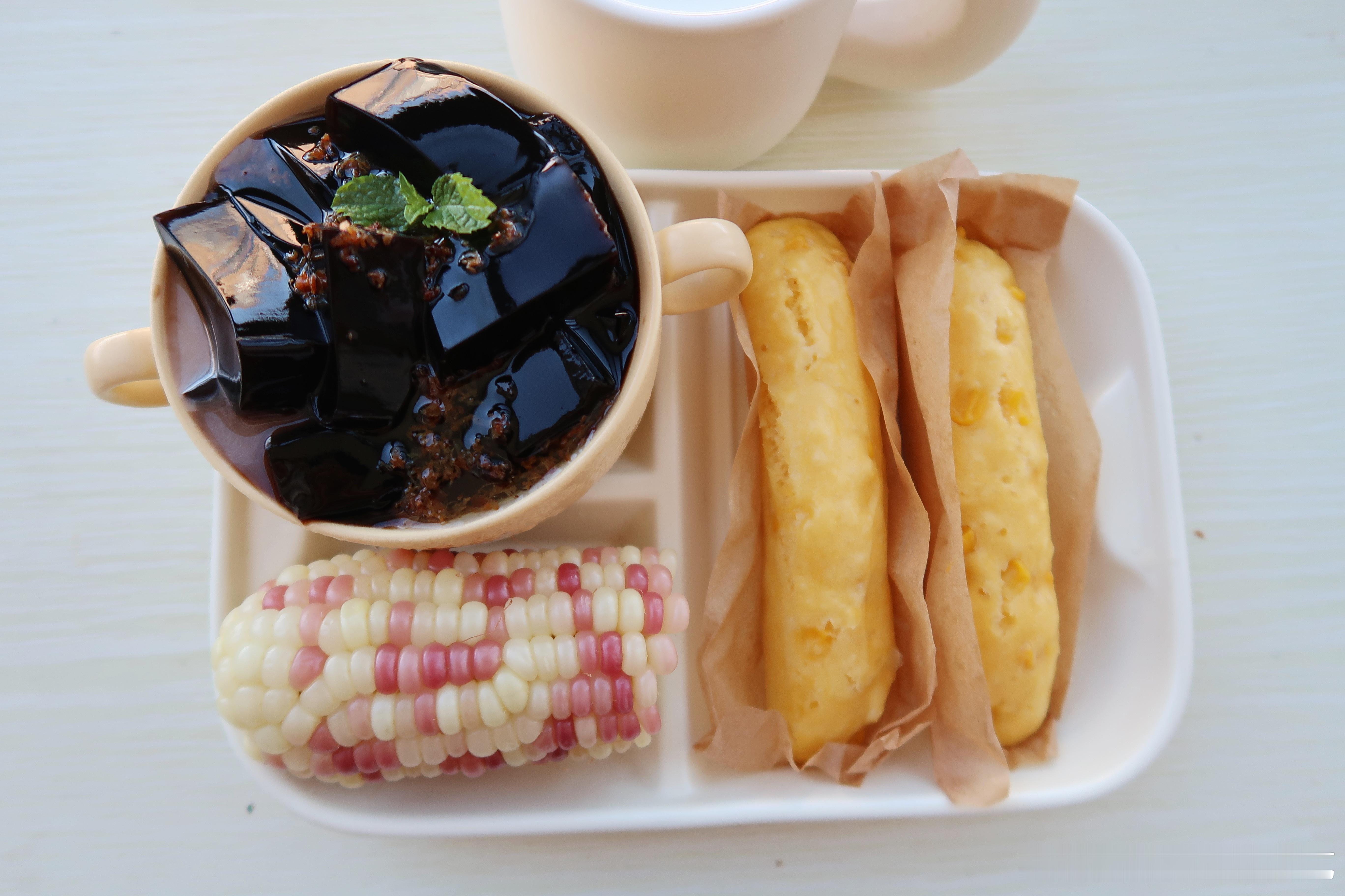 早.今天的早餐是玉米粑粑、糯玉米、桂花烧仙草、牛奶