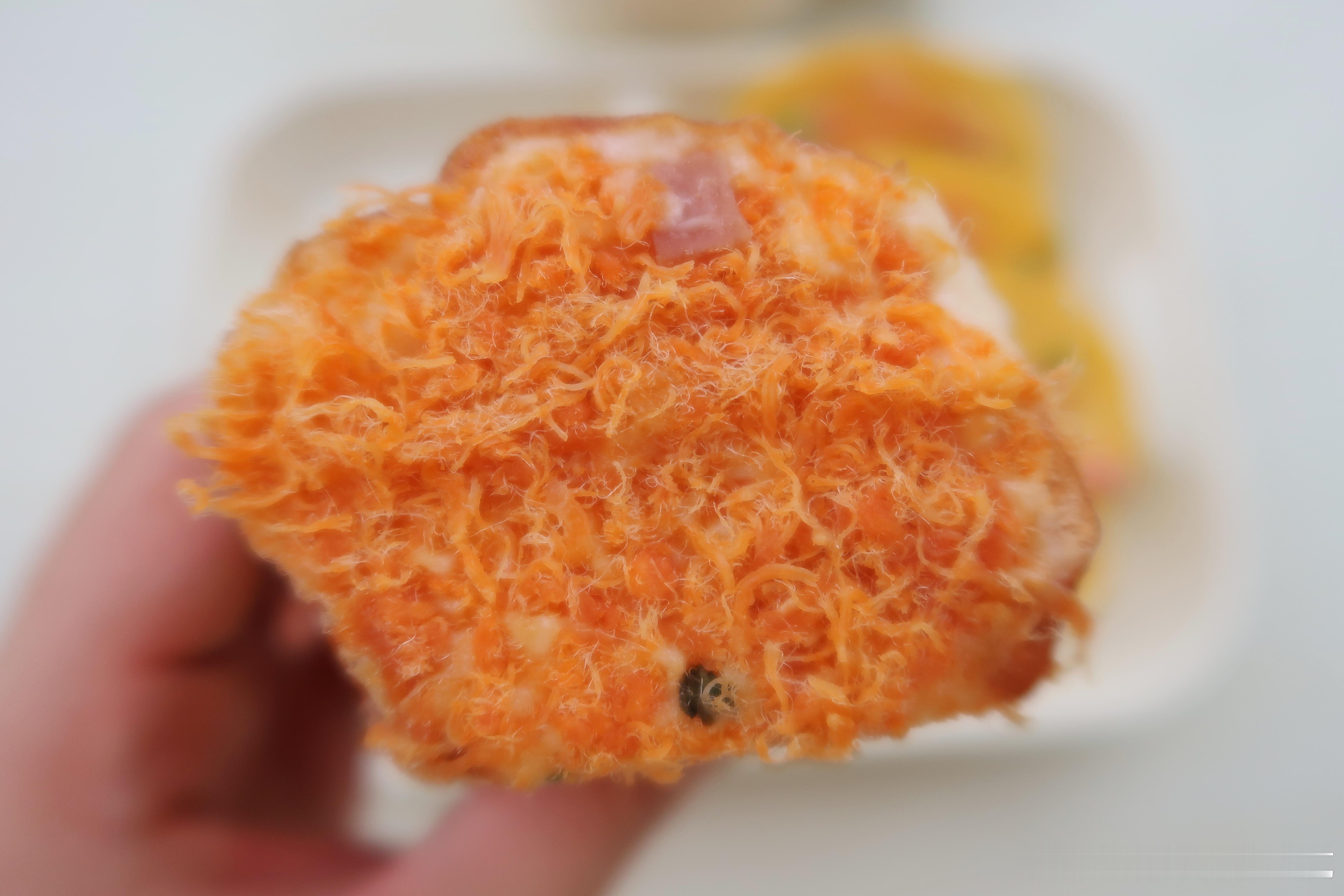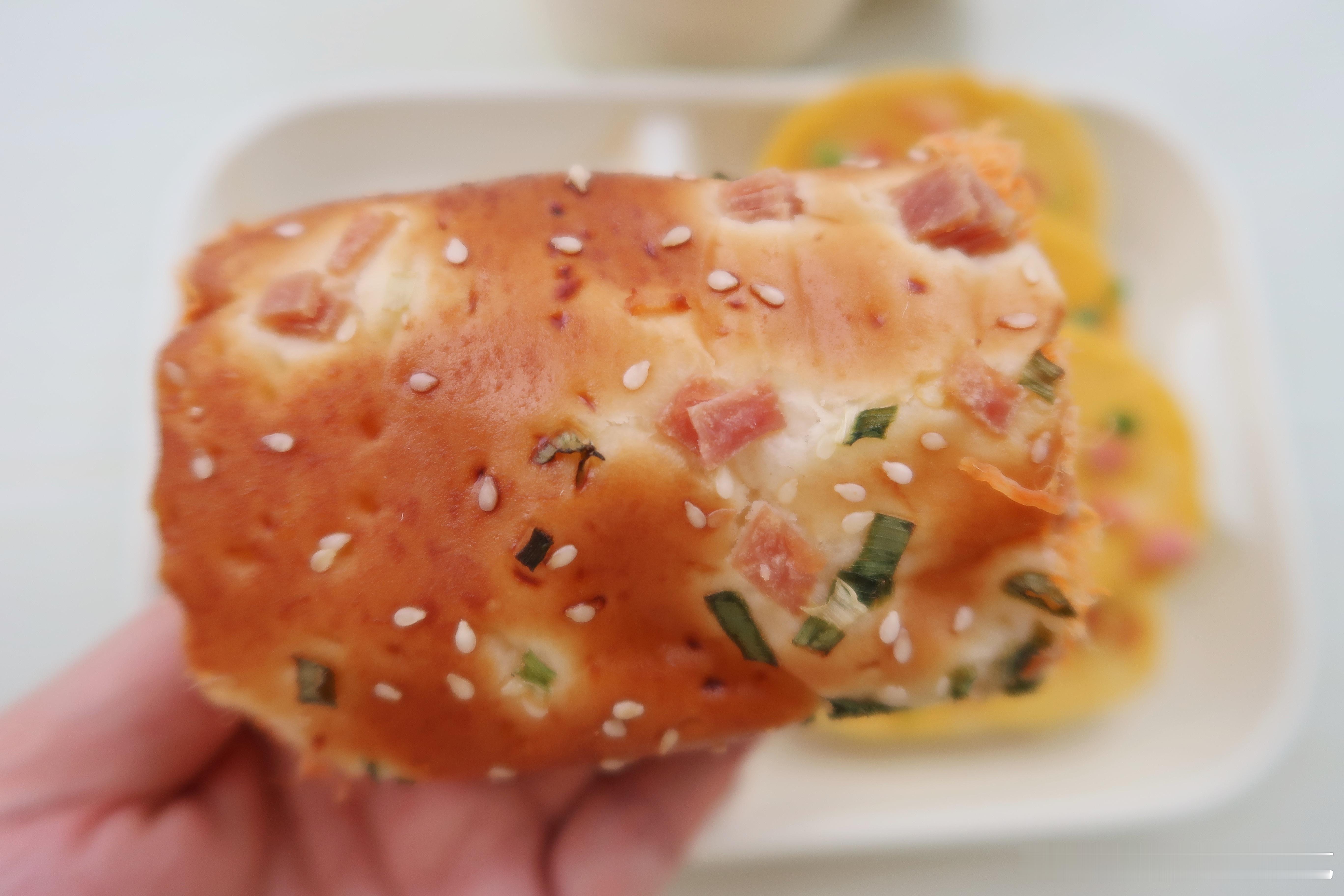 今天吃煎馒头片,白馒头切片,鸡蛋2个加入小葱和火腿丁搅散,馒头表面裹上蛋液,放锅里煎熟即可,超级香.盒马的香葱肉松面包卷,面包体松软色拉酱的量也不过多还不错.