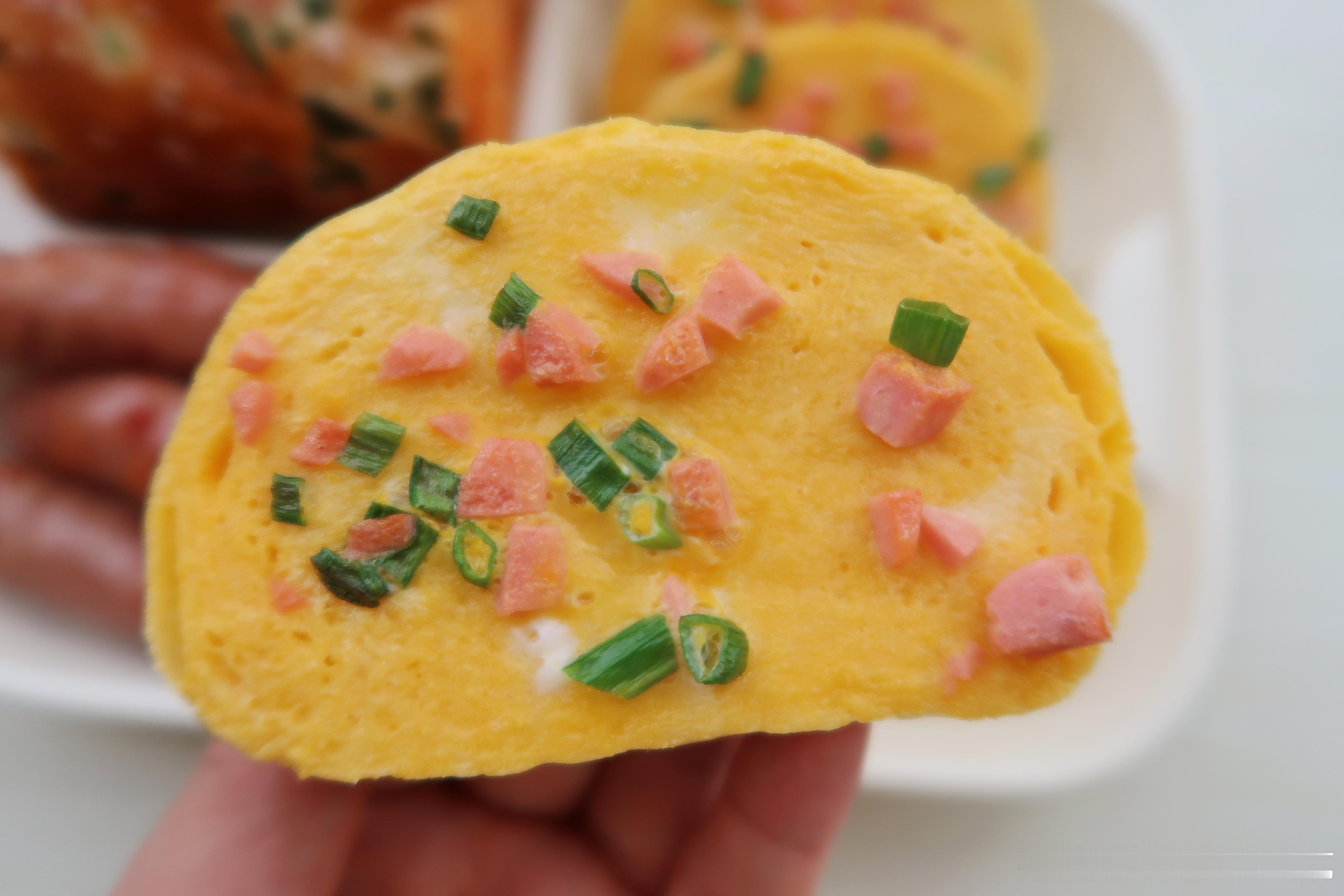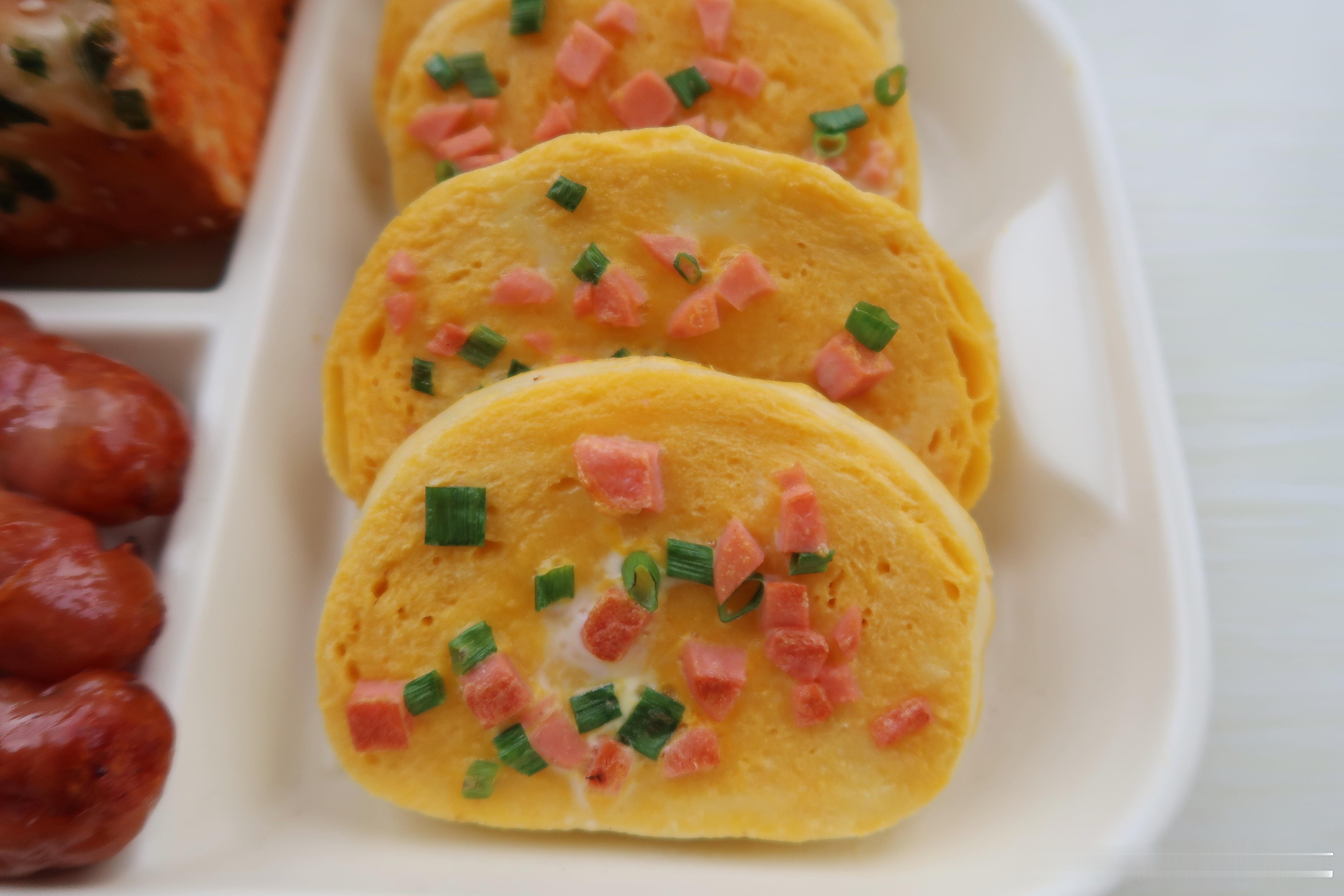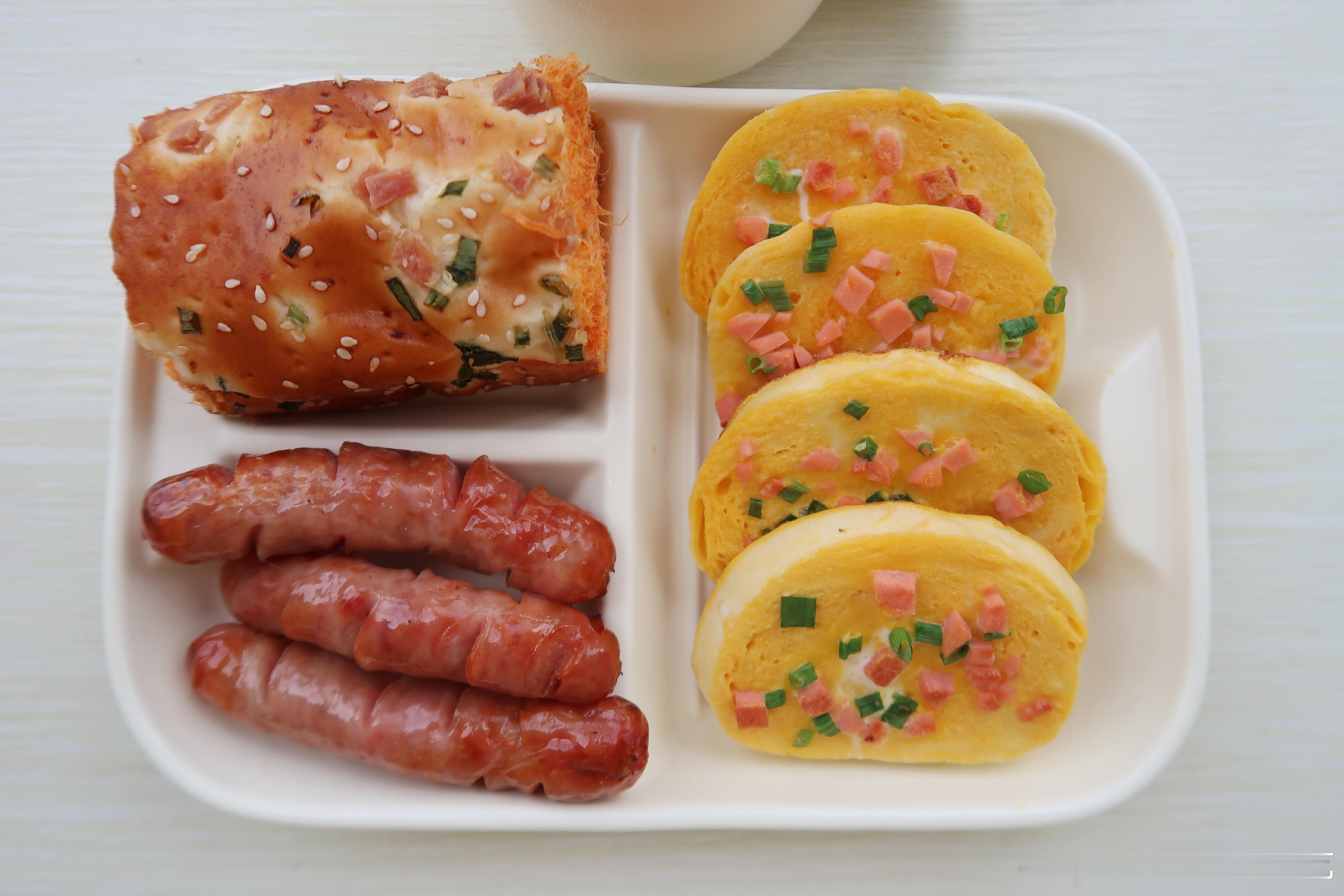 周末早.今天的早餐是火腿蛋煎馒头片、香葱肉松面包卷、烤香肠、牛奶