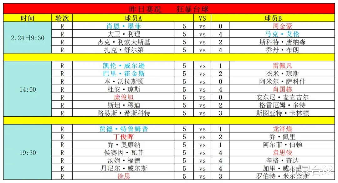 老表们大家好我是老扯,世界公开赛的第二天打完了,完结了15场比赛,全部都是64进32的比赛,前16方面6位出战5胜1负,熬老头大师炮哥被老头熬死了,除了炮哥之外,昨天最意外的翻车来自于本赛季的稳定先生肖国栋,厨子哥4-0开局后被菜鸡对手5连鞭淘汰,墨菲状态依旧又轰出了147满分,小特和丁俊晖等依然是胜利和破百两手抓,袁思俊、加里·威尔逊等这都是抽象大师,看的时候反胃回顾的时候想吐。