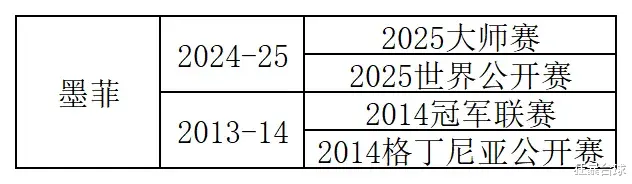墨菲在1月份的大师赛中刚打出满分,加上昨天这一杆,本赛季墨菲已经打出了2杆147,同时徐思也是两杆,加上本赛季的墨菲和徐思,单赛季多杆满分历史上一共有15次了,墨菲也成了历史上第3位多次做到这一点的球员,前两位分别是希金斯和奥沙利文,希金斯曾3次单赛季两杆147,火箭又2次,墨菲也有两次。当然本赛季墨菲和徐思都是两杆147,单赛季同时有两位球员都打出了多杆147,这是历史上第2次,1999-2000赛季最炸裂,当时亨皇、老张和火箭各打出两杆。