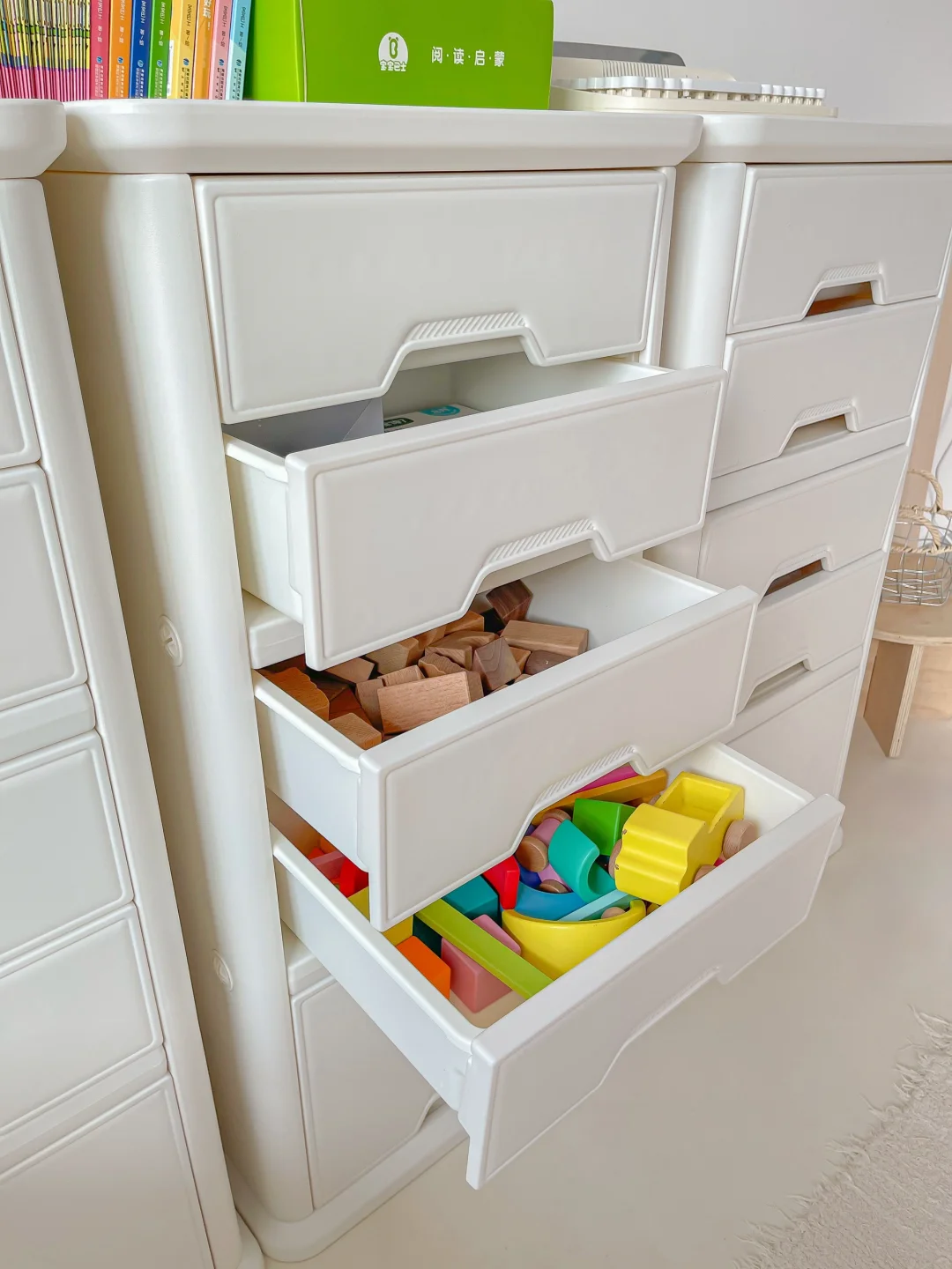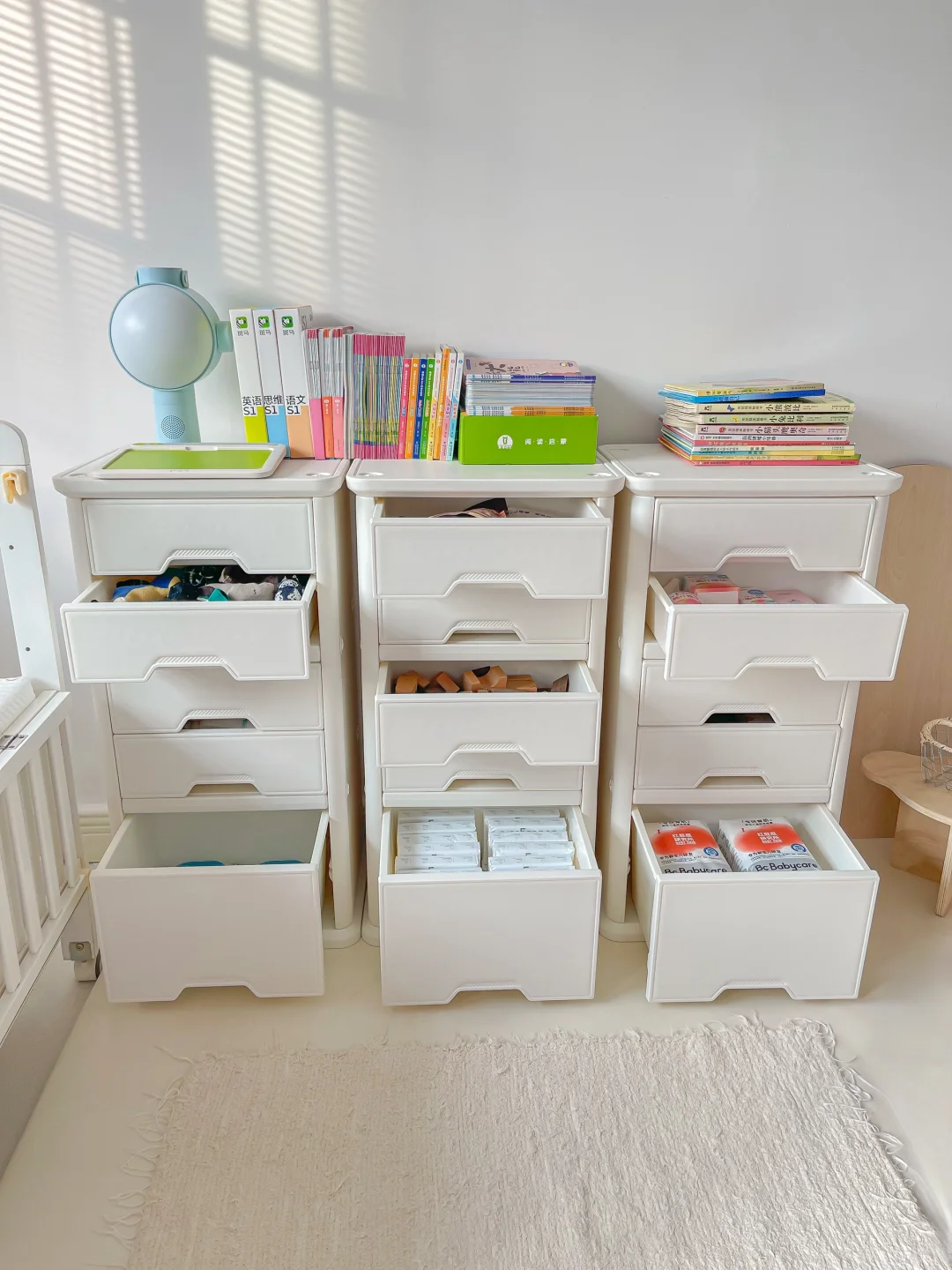 挑了好久的收纳柜 最后被它的颜吸引了!这个颜色真的好奶 有个爱看绘本的宝宝👶🏻 无缝的台面,可以许多宝宝的绘本 于是我给他布置了一个阅读角落📖 还有hin多的抽屉,可以把宝宝的日用品和玩具都放进去 日常分类可方便了,儿童房再也不会乱乱的啦