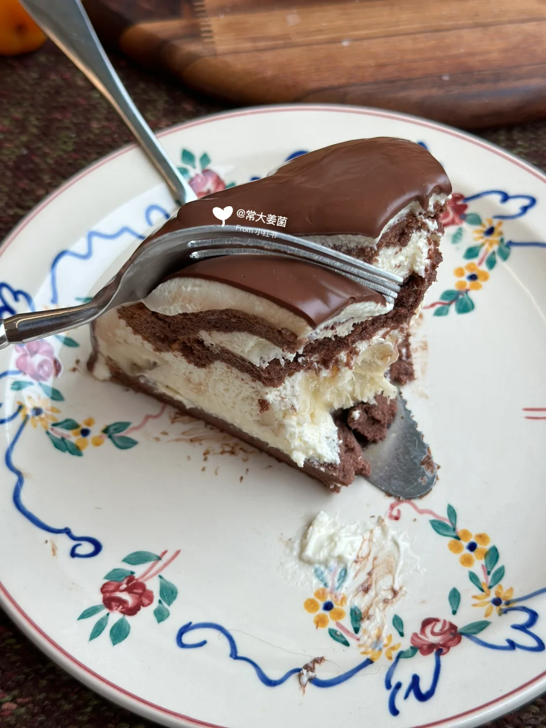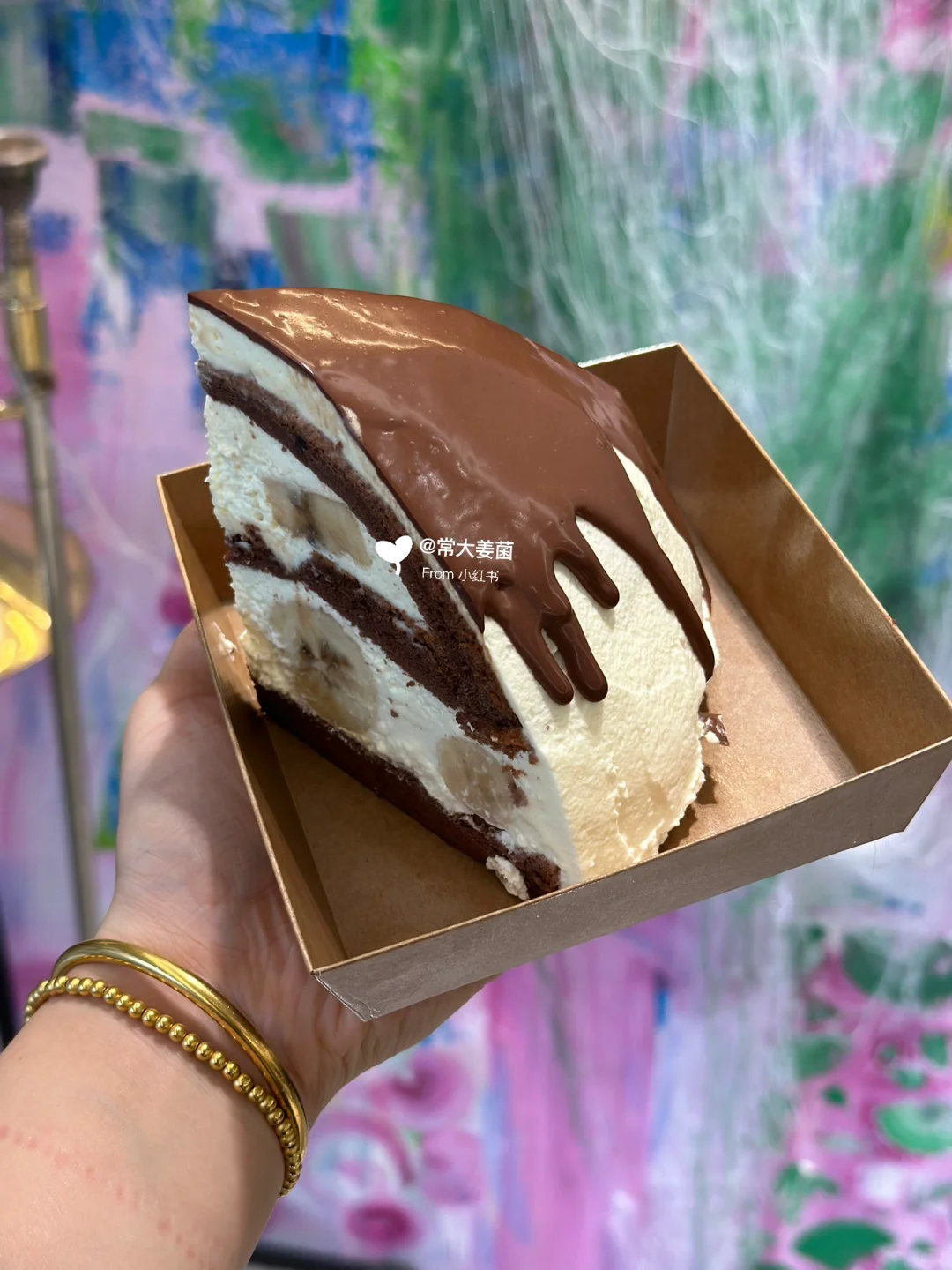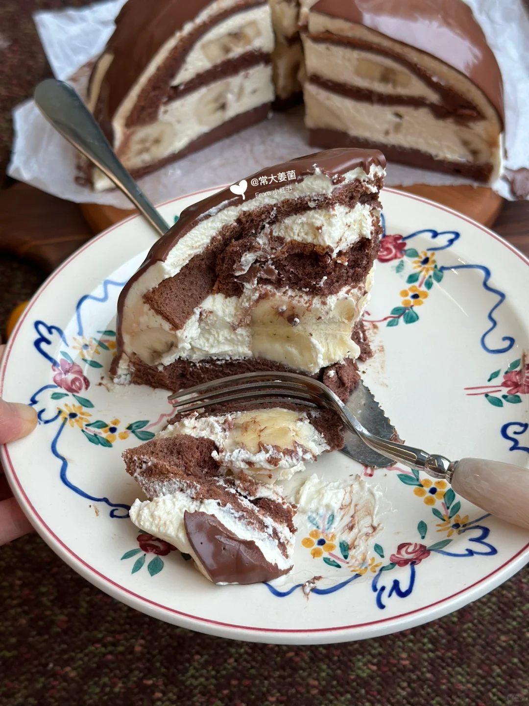 这蛋糕是真的好吃啊姐妹!! 😭😭😭层次多~ 奶油香醇一点不甜腻,可可戚风浓郁口感绵密,香蕉香甜,0糖配方的黑巧甘纳许淋面苦香浓醇,绝了好嘛!!