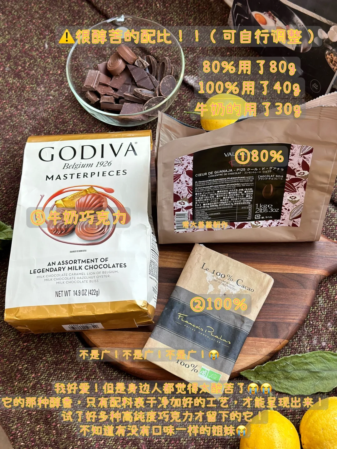 如果你有一颗刁钻的黑巧胃🍫 这个配方能给你满分答案💯 如果你不习惯特别苦可以自行调配黑巧的比例!或者直接买60%含量的巧克力🍫 小唠叨嘿嘿 🥹不知道有没有喜欢100%可可黑巧的姐妹! 我可真的喜欢了要了命😭虽然刚入口是酸苦的,但是回甘回香浓郁到上头~回味无穷!而且可可含量高的黑巧对心脏和刷脂有好处哦!