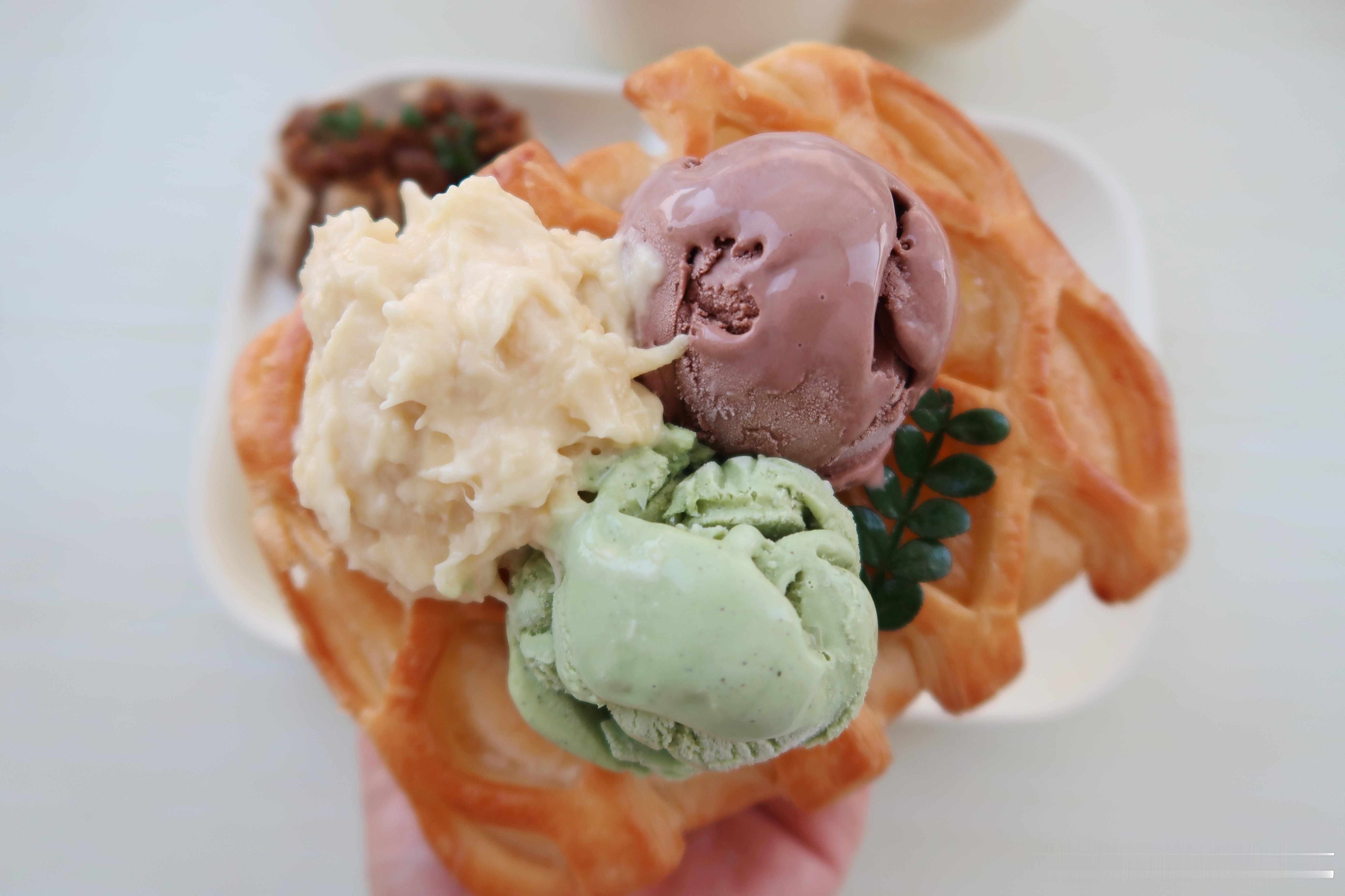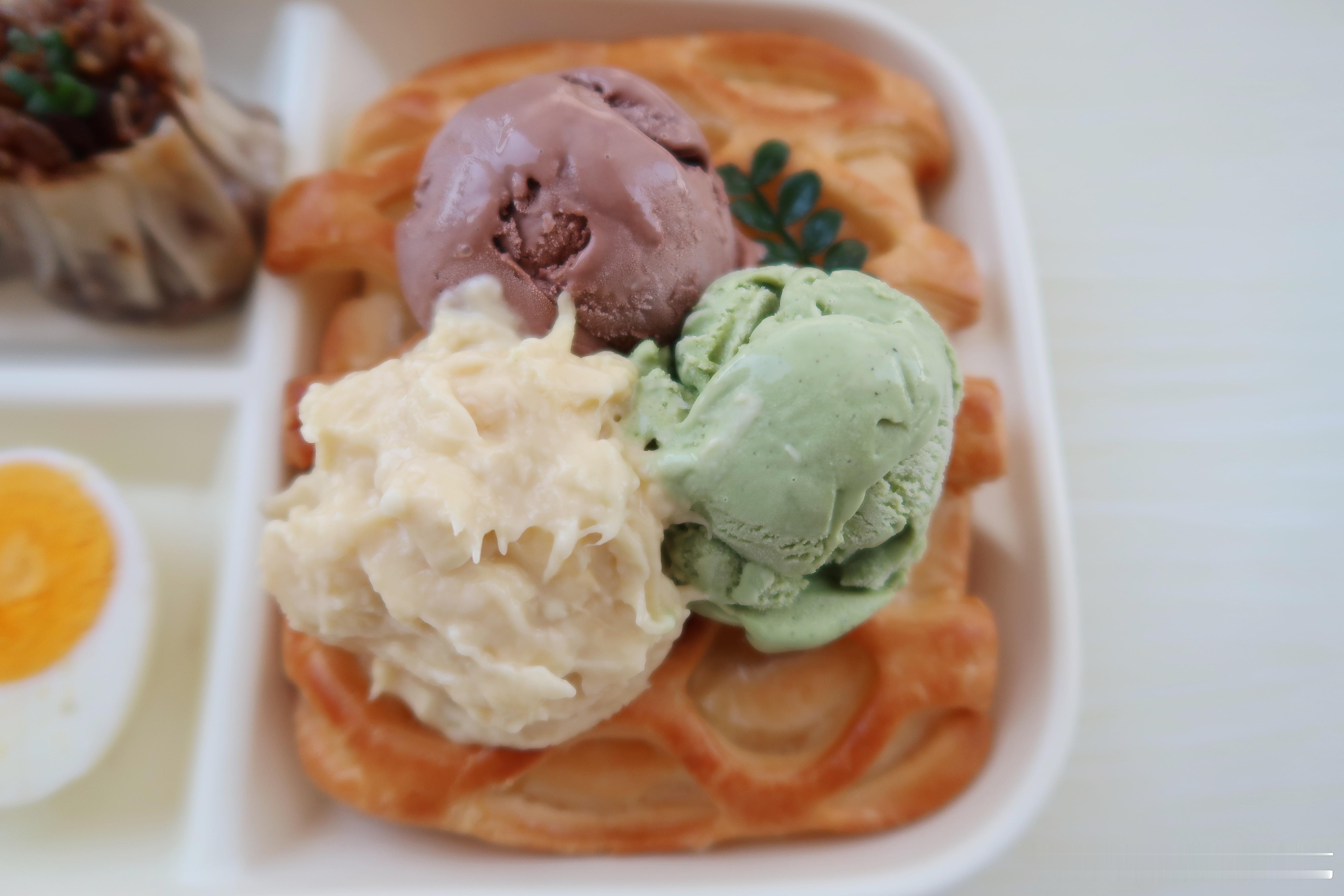 天气太热啦,今天吃冰淇淋面包,酥皮面包用空气炸锅复烤,放上可可冰淇淋、抹茶冰淇淋和榴莲球,太好吃啦.