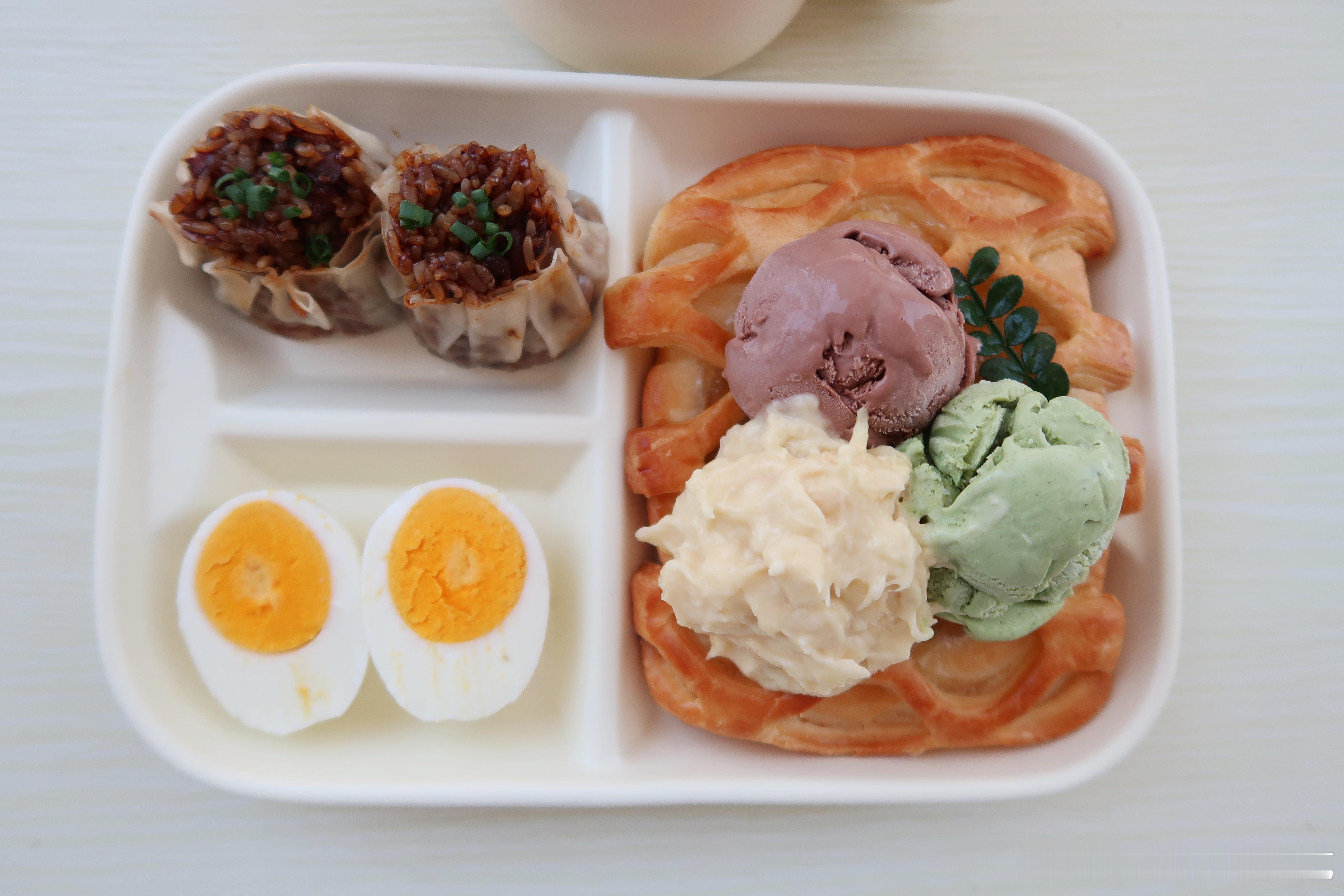 周末早.今天的早餐是冰淇淋吐司🍞黑椒牛柳烧卖🍚鸡蛋🍳豆浆🥛