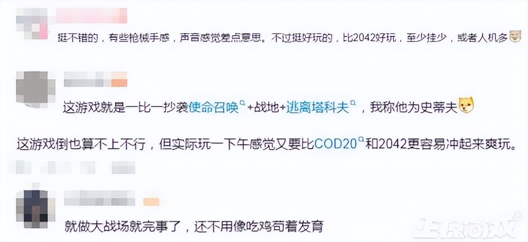 有网友表示,挺不错的,有些枪械手感,声音感觉差点意思。不过挺好玩的,比《战地2042》好玩,至少挂少或者人机多。也有网友吐槽,这游戏就是一比一抄袭使《命召唤》+《战地》+《逃离塔科夫》,我称他为“逃离塔科夫”。也有网友表示,玩一下午感觉要比《COD 20》和《战地2042》更容易冲起来爽玩。还有网友表示,就做大战场就完事了,还不用像吃鸡那样苟着发育。