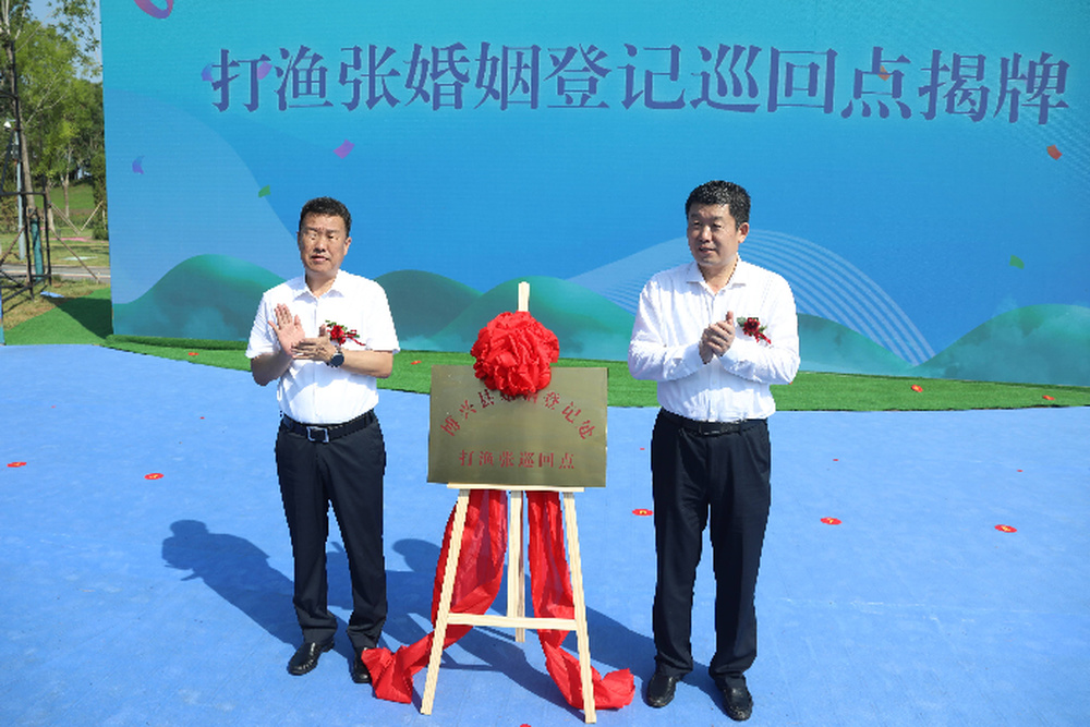 滨州市民政局党组书记、局长王亨波,博兴县委副书记、县长孙战勇共同为博兴县婚姻登记处打渔张巡回点揭牌