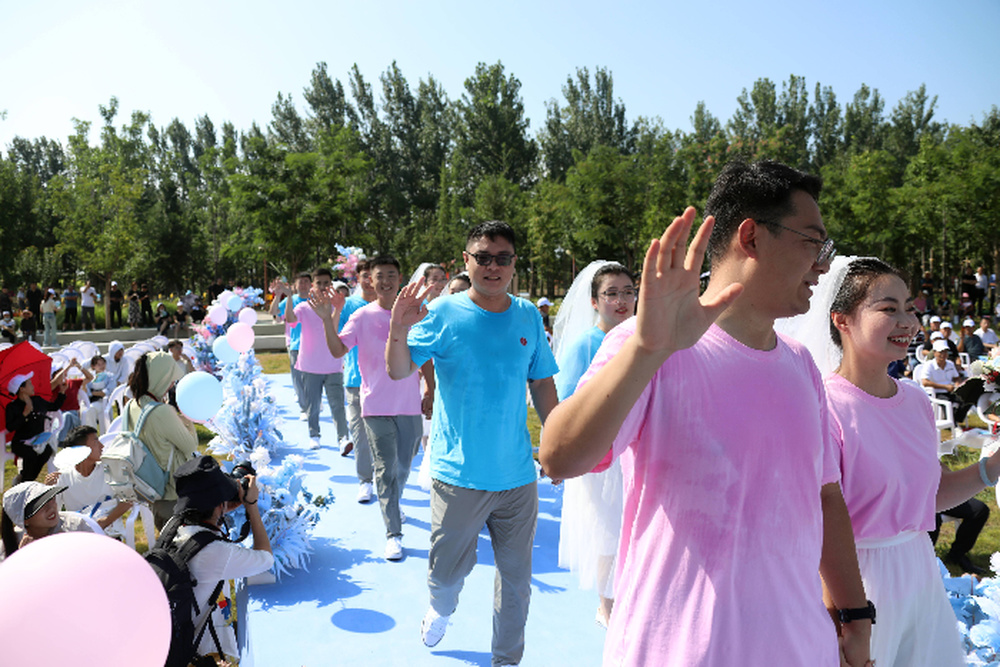 10对新人在活动现场拍照后,乘双人观光自行车围绕美丽的黄河边骑行,向他们的幸福未来驶去。整场婚礼不讲排场、不慕虚荣、不比阔气,让婚礼回归幸福的本质。