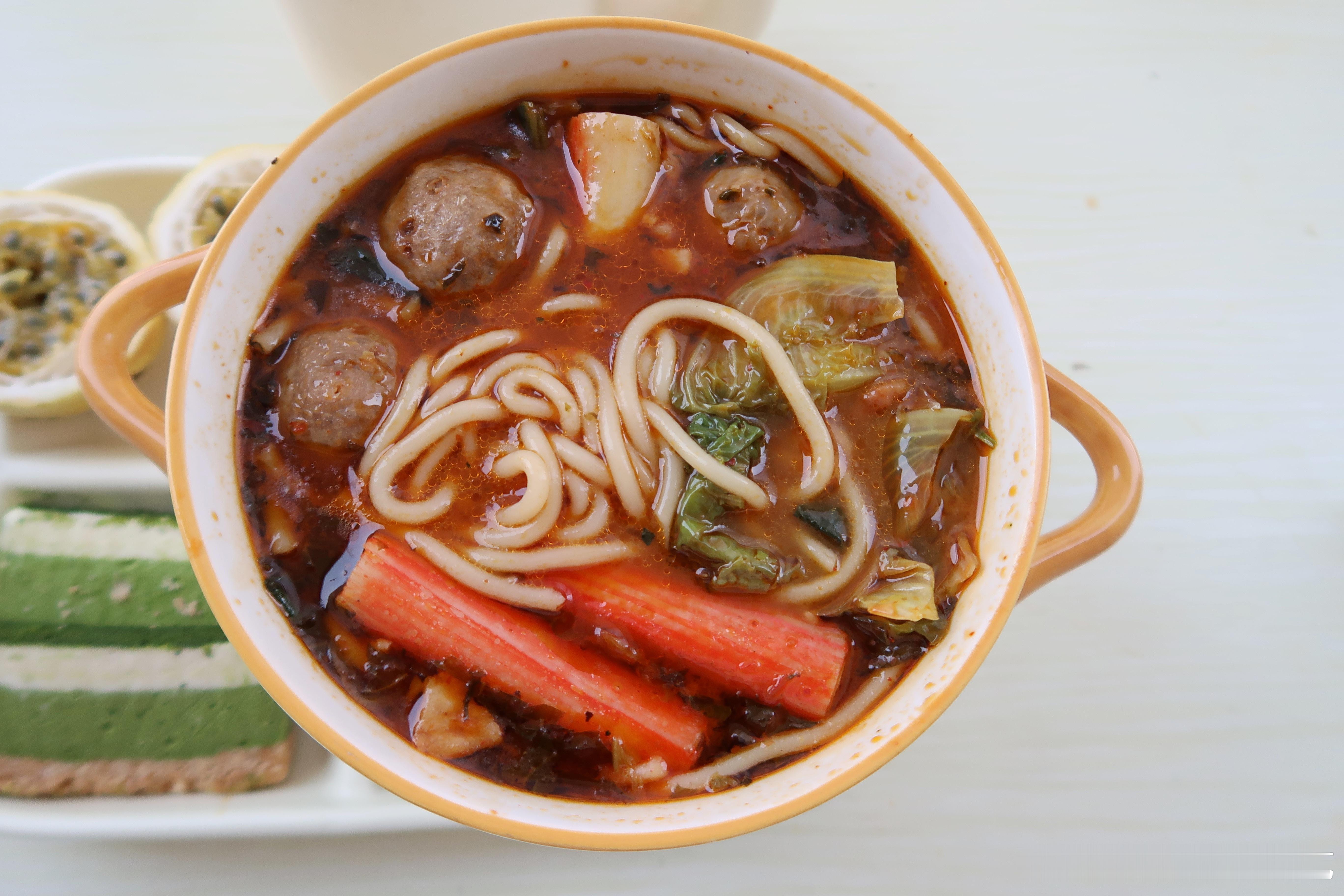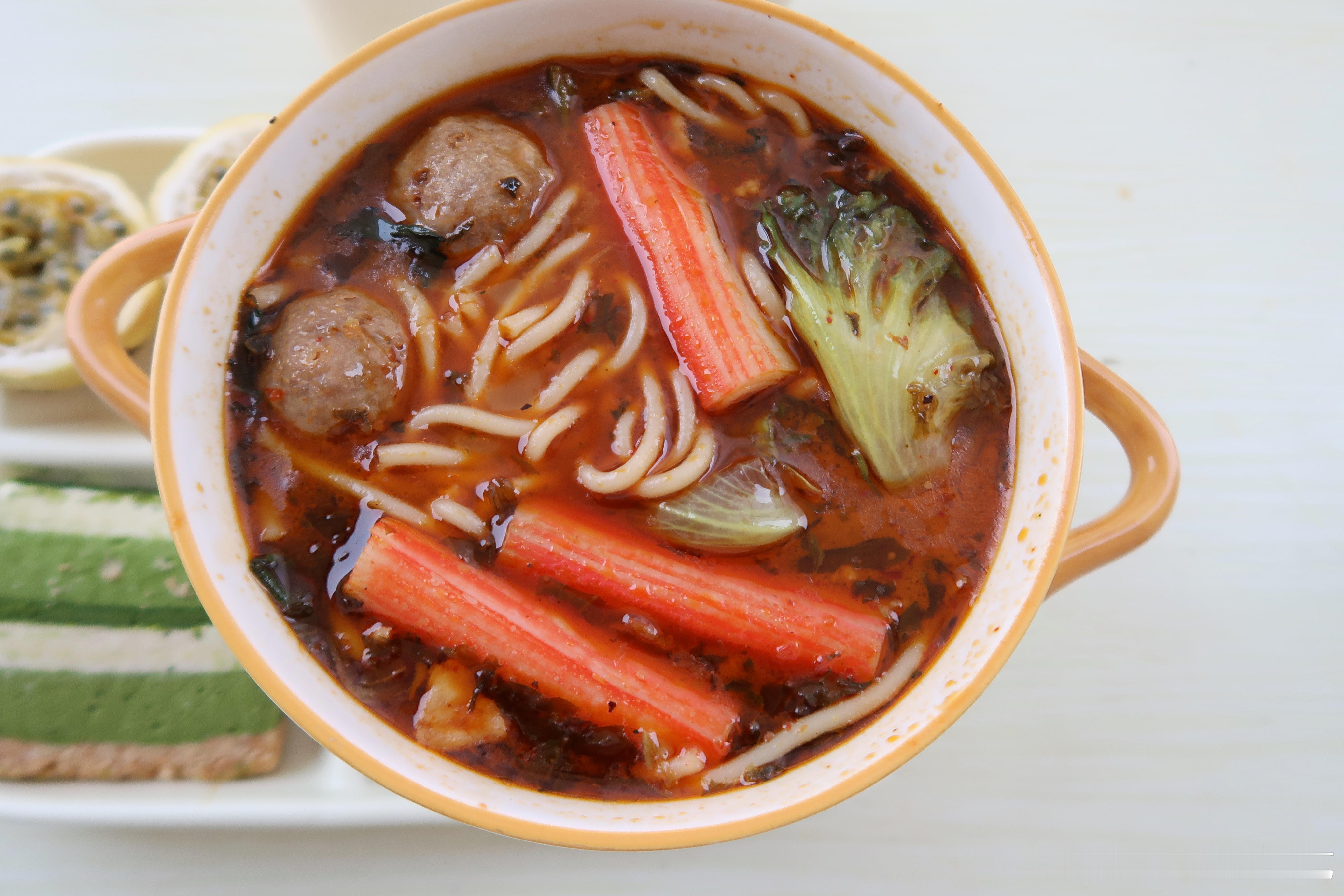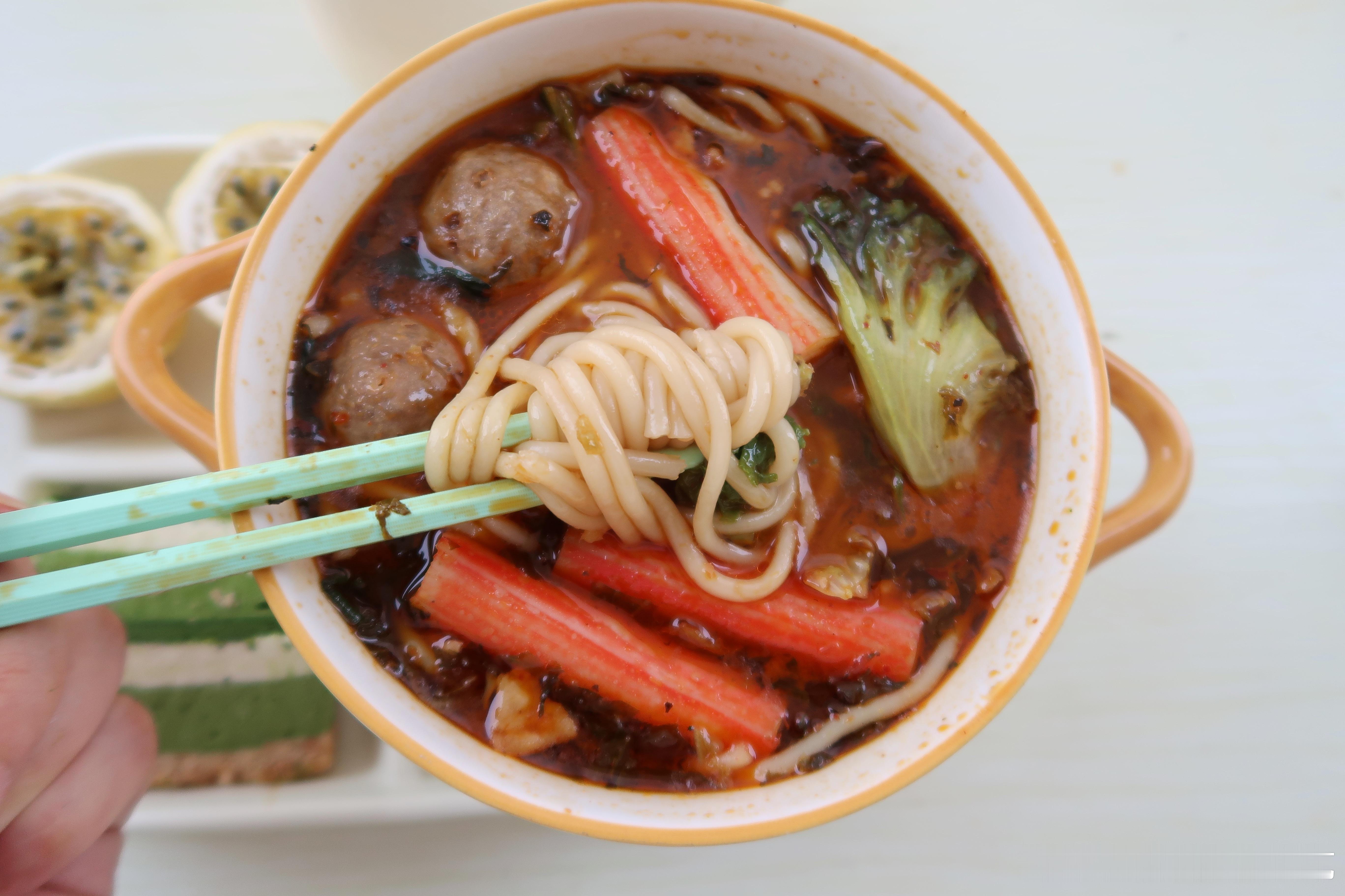 今天吃焖肉米线,买的速食米线,里面有大块焖肉,我还加了牛肉丸、蟹肉棒、煎蛋和生菜,是一碗料足的米线.