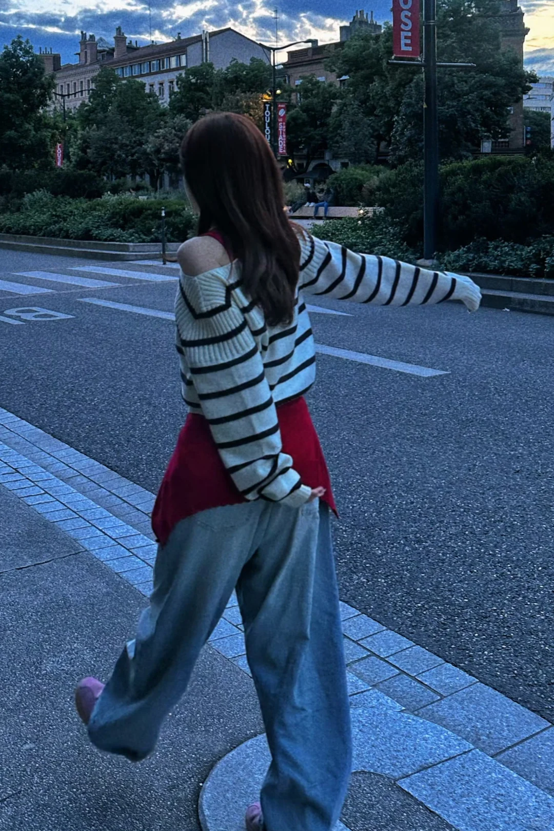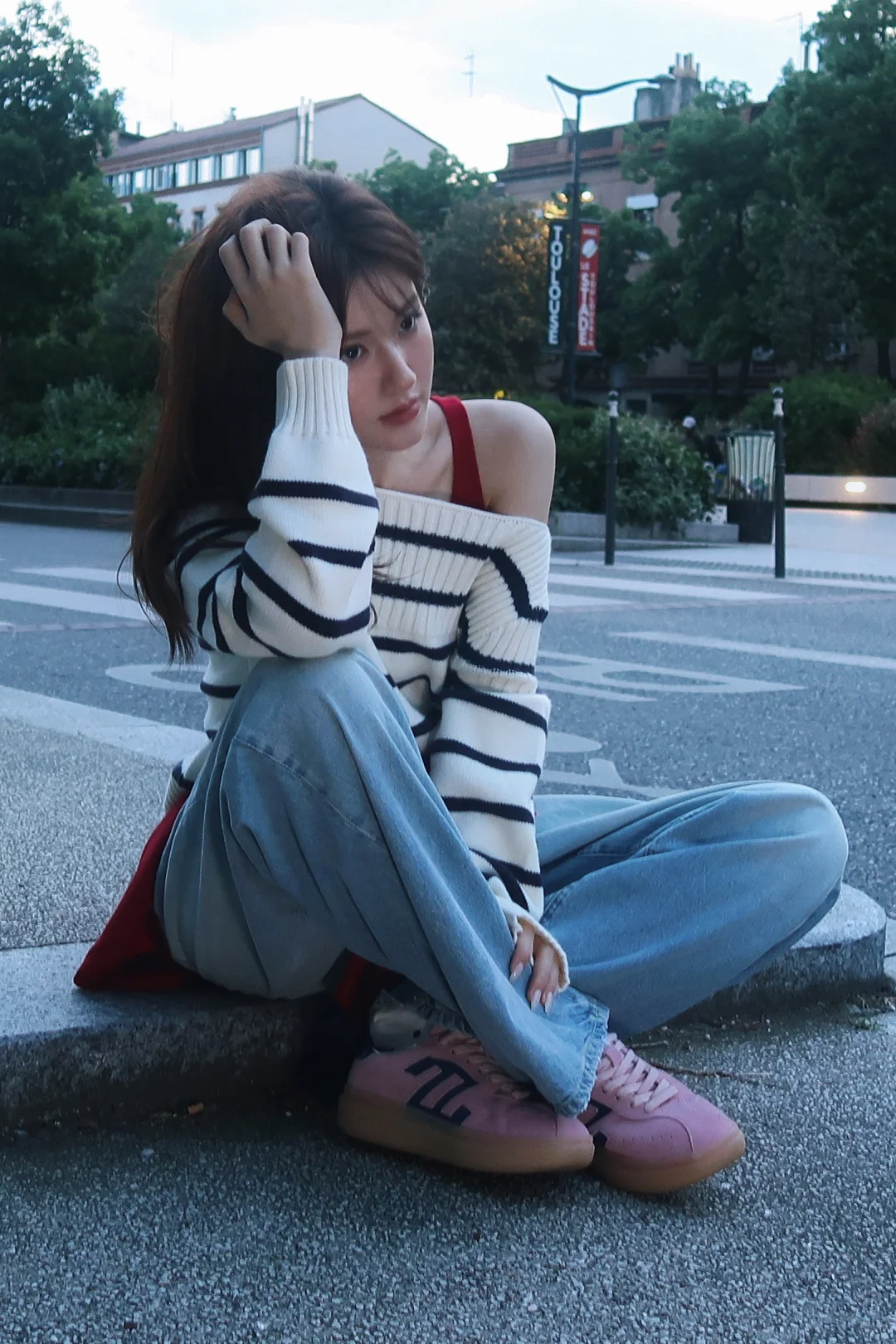 ✨赵露思📆240521 更新巴黎街拍,可爱又洒脱~ ▶️Look解析 外套 | Rolarola 一字领条纹长袖针织衫 裤子 | R13 低腰褶皱落裆阔腿牛仔长裤 鞋子 | 莎莎苏ZSAZSAZSU 厚底复古板鞋 -
