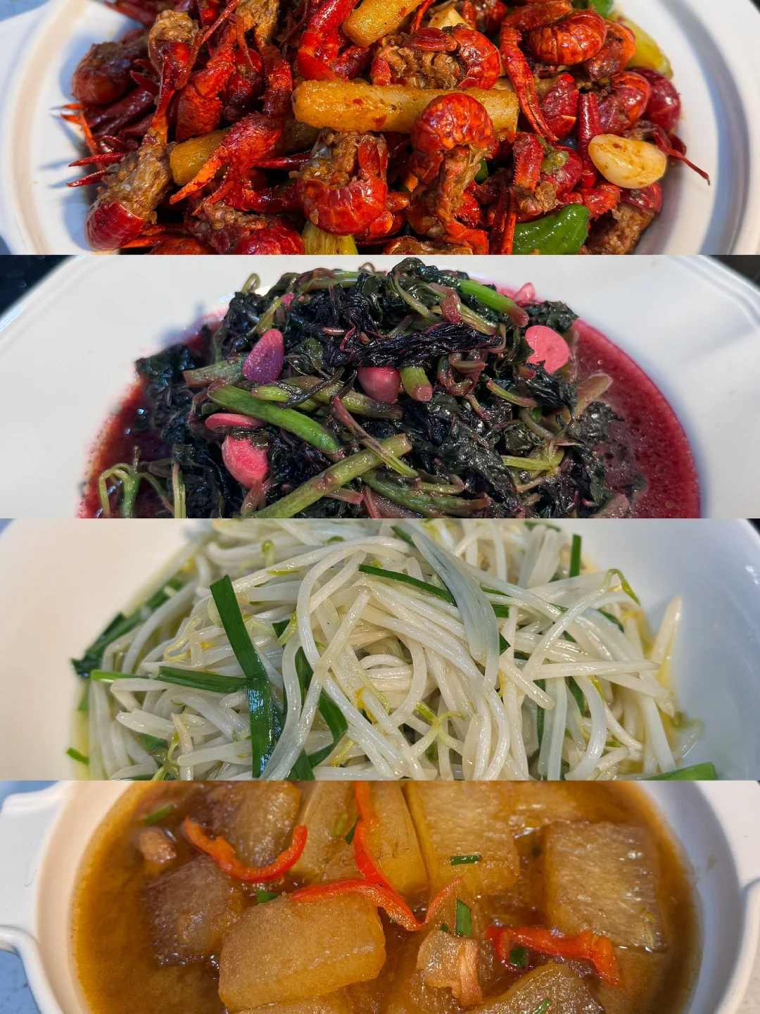 5️⃣香辣小龙虾➕蒜蓉苋菜➕清炒绿豆芽➕红烧冬瓜