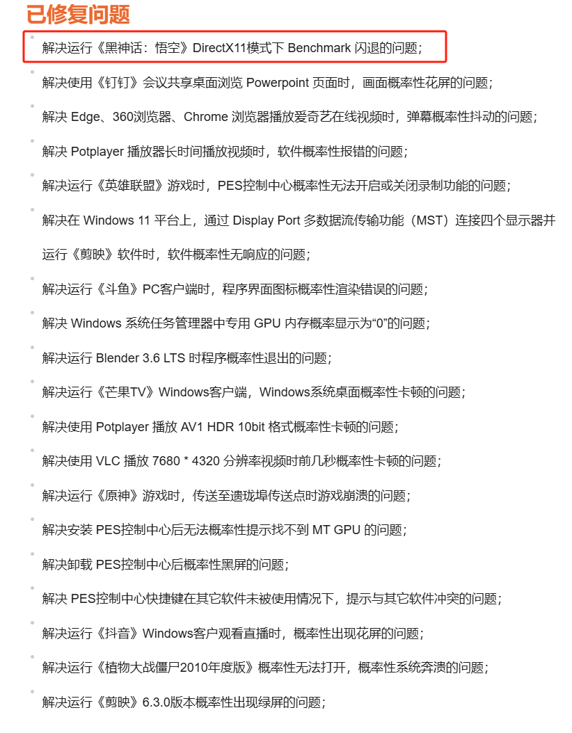 摩尔线程解决黑神话闪退问题,国产显卡配国产3A有没有搞头? 短标题:国产显卡发布新驱动,畅玩黑神话指日可待? 8月20日,国产显卡厂商摩尔线程发布了版本号为v270.80的图形显卡驱动程序。解决了此前其MTT S系列显卡在DirectX 11模式下运行《黑神话:悟空》性能测试工具的闪退问题,并且官方表示已经在针对该游戏进行优化,可以期待后续版本的游戏体验。根据目前网友的测试来看,能启动并不代表能玩,实际测试成绩还是不甚理想,其中B站UP主逆熵WELT在2K全低画质下开启帧生成跑到平均13帧,另一位UP主步六孤道使用中科海光3250平台+MTT S80在1080P全低画质下开启帧生成跑到了平均31帧。 而此次更新除了解决《黑神话:悟空》测试工具闪退问题,还对更多DirectX 11游戏进行了支持,帧率提升显著。同时还在Win10和Win11下实现了对OpenGL 4.1的全面支持,同时支持AV1格式编码和VC1格式解码,极大提高生产力。 作为国产GPU厂商,摩尔线程发布的MTT S80做到了国产游戏显卡从0到1的成就,亦如《黑神话:悟空》对中国大型单机游戏的意义。发布至今平均30天一个驱动版本,累计正式发布的适配和优化游戏152款,足以证明他们对玩家的责任和担当。虽然目前展现出的实际效果与玩家期待还有不小的差距,不过可以相信终有一天他们会直面天命,冲破障壁。