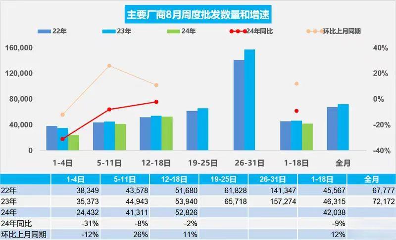 【乘联会:8月1-18日乘用车市场零售90.7万辆 同比增长8%】8月21日,乘用车市场信息联席会(乘联会)公布了最新销量数据,8月1-18日乘用车市场零售90.7万辆,同比去年8月同期增长8%,较上月同期增长16%,今年以来累计零售1,247.4万辆,同比增长3%。 乘用车:8月1-18日,乘用车市场零售90.7万辆,同比去年8月同期增长8%,较上月同期增长16%,今年以来累计零售1,247.4万辆,同比增长3%;8月1-18日,全国乘用车厂商批发75.7万辆,同比去年8月同期下降9%,较上月同期增长12%,今年以来累计批发1,447.7万辆,同比增长4%。 新能源:8月1-18日,乘用车新能源市场零售49万辆,同比去年8月同期增长58%,较上月同期增长27%,今年以来累计零售547.8万辆,同比增长36%;8月1-18日,全国乘用车厂商新能源批发43.1万辆,同比去年8月同期增长33%,较上月同期增长21%,今年以来累计批发599.3万辆,同比增长30%。 8月第一周乘用车市场日均零售4.1万辆,同比去年8月同期增长2%,较上月同期增长5%。 8月第二周乘用车市场日均零售5.1万辆,同比去年8月同期增长10%,较上月同期增长23%。 8月第三周乘用车市场日均零售5.5万辆,同比去年8月同期增长8%,较上月同期增长16%。 8月1-18日,乘用车市场零售90.7万辆,同比去年8月同期增长8%,较上月同期增长16%;今年以来累计零售1,247.4万辆,同比去年增长3%。 8月第一周乘用车厂商批发日均2.4万辆,同比去年8月同期下降31%,环比上月同期下降12%。 8月第二周批发日均4.1万辆,同比去年8月同期下降8%,环比上月同期增长26%。 8月第三周批发日均5.3万辆,同比去年8月同期下降2%,环比上月同期增长11%。 8月1-18日,全国乘用车厂商批发75.7万辆,同比去年8月同期下降9%,较上月同期增长12%,今年以来累计批发1,447.7万辆,同比增长4%。【来自懂车帝车友圈】