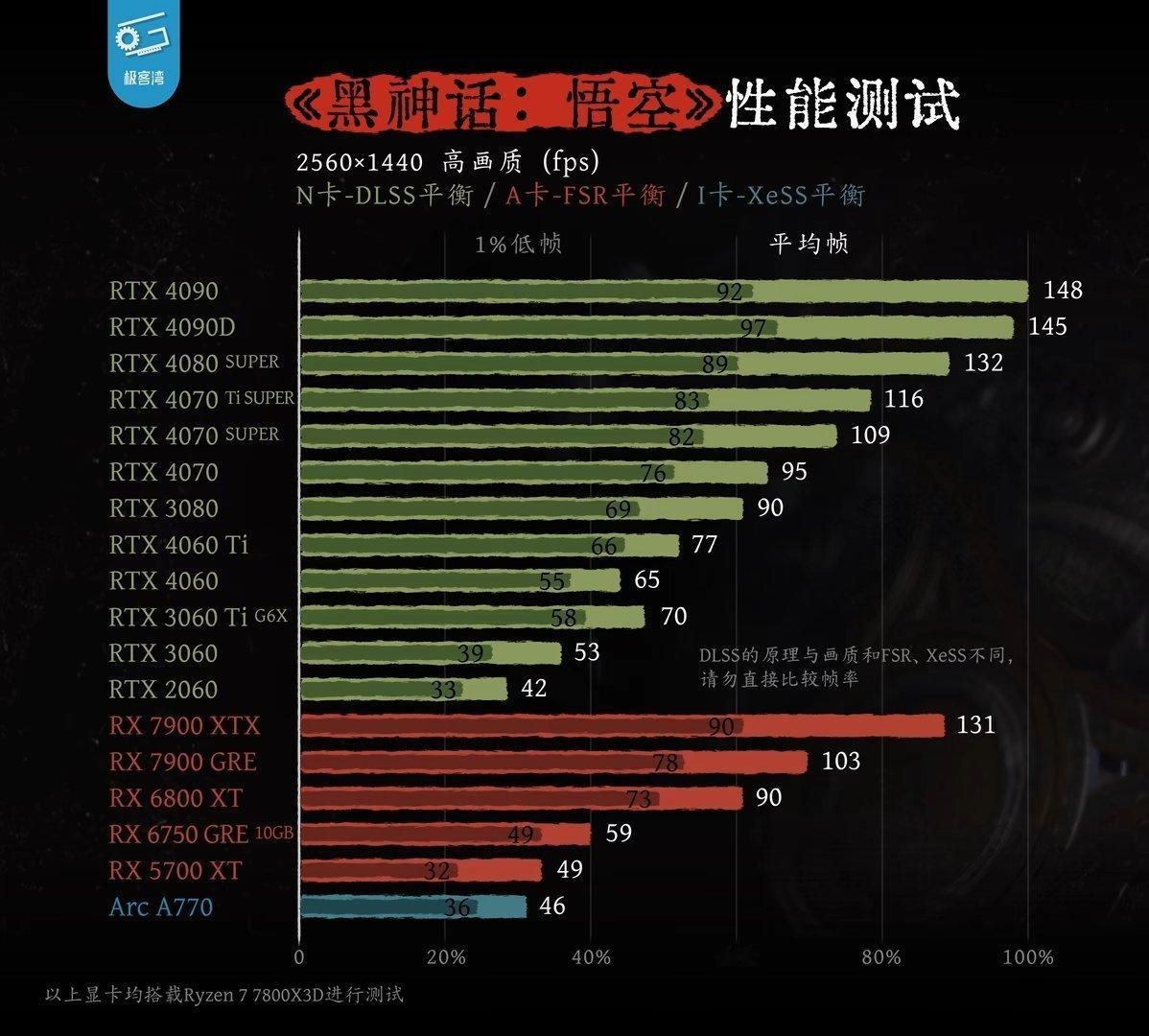 对于游戏玩家来说,帧率是非常关键的一个数值,45帧算能玩,60帧算稳定,90帧以上才称得上流畅,尤其是《黑神话:悟空》这类比较考验操作和反应速度的游戏,帧率的重要程度会更扩大,如今的帧率除了与GPU性能成正比外,还与帧生成技术挂钩,目前英伟达的DLSS是一众帧生成中提神升最是明显的,DLSS 3能用AI重建多达7/8的显示像素,目前《黑神话:悟空》仅支持DLSS3技术(英伟达40系列显卡独有的技术),再加上20号一大早更新了一版专为《黑神话:悟空》做的驱动,英伟达40系列显卡的优势就进一步提升了。