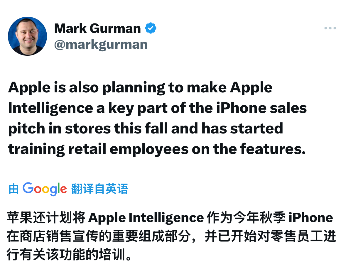 在后续推文中古尔曼还表示,苹果已经开始对零售店员工进行 Apple Intelligence 的培训,并预计将其将作为 iPhone 16 在苹果零售店销售宣传的重点。