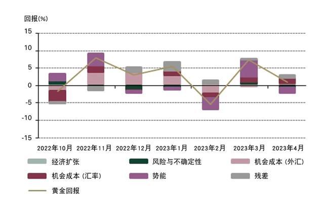 *数据截至2023年4月28日。我们的短期金价表现归因模型(GRAM) 是有关金价月度回报的多元回归模型,其中包括四类关键的金价表现驱动因素:经济扩张、风险与不确定性、机会成本和势能,这些驱动因素的相关主题反映了黄金需求背后的动机,更为重要的是投资需求背后的动机。这些被认为是短期内黄金价格回报的边际驱动因素。“残差”包含了目前模型尚未捕捉到的其他因素。此处结果是基于2007年2月至2023年4月的分析。