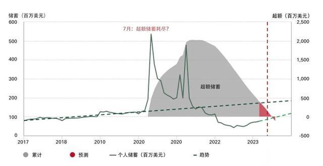 但令人担忧的是,这些超额储蓄似乎很快就会耗尽。而当储蓄不足时,特别是在物价高企的情况下,人们不得不控制支出或通过借贷来补充。