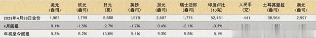 表1:4月黄金回报喜忧参半,仅在美元金价历史高点以下盘整