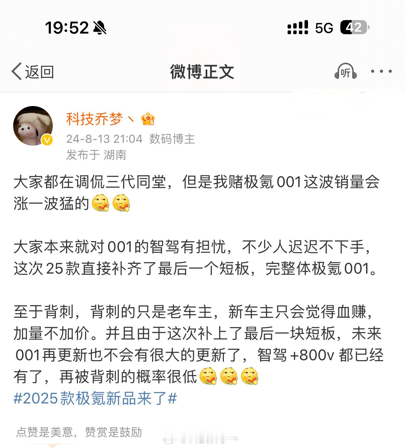 只要后面的用户觉得产品竞争力的确够强,自然会选择。那些老车主把热度炒这么高只会让更多人知道有极氪这么一个品牌。#智驾数码团#