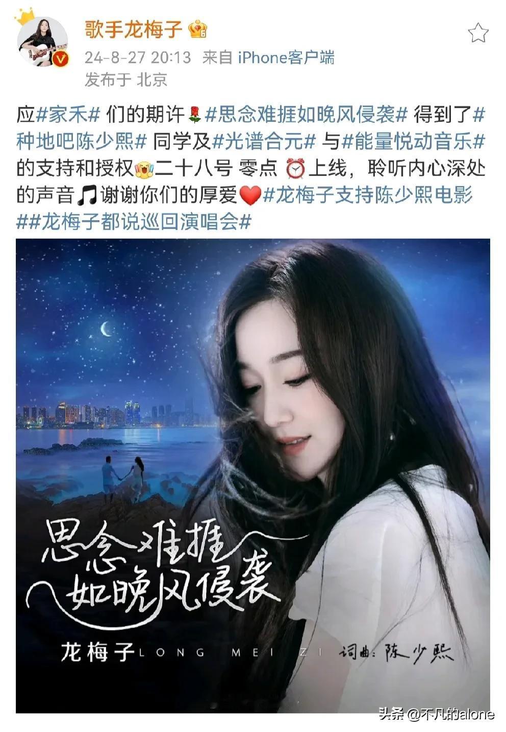 8月27日,龙梅子发文透露,她已得到陈少熙、光谱合元以及能量悦动音乐的授权,翻唱陈少熙写的歌曲《思念难捱如晚风侵袭》将于8月28日上线。 我原来觉得翻唱一首歌曲只要词曲创作者同意就行了,没想到要几个公司同意才行,可见版权的重要性。这让我想起陆虎了,要是他当年没有签词曲版权,现在可能都是富翁了,哈哈哈。 我们的老九也是出息了,自己写的歌,妈妈第一个翻唱,而且陈少熙创作的两首歌都蛮好听。希望陈少熙在做好一个演员时,也继续创作歌曲。 #记录我的8月生活#