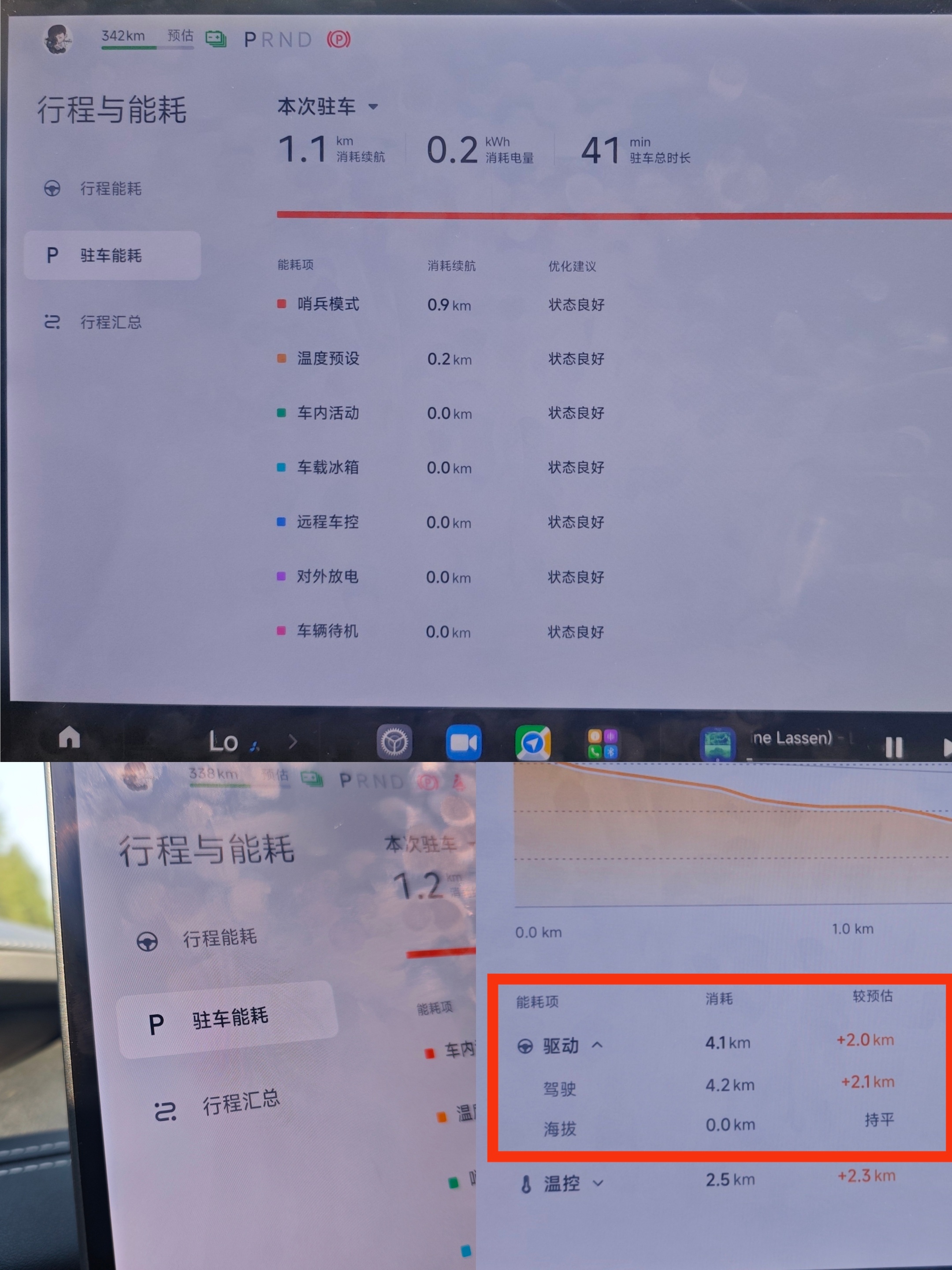 能耗显示界面新增了驻车能耗,涵盖了包括空调、哨兵,冰箱以及外放电等等,行程能耗更加细致,小的选项可以点开后查看单独的细分能耗。