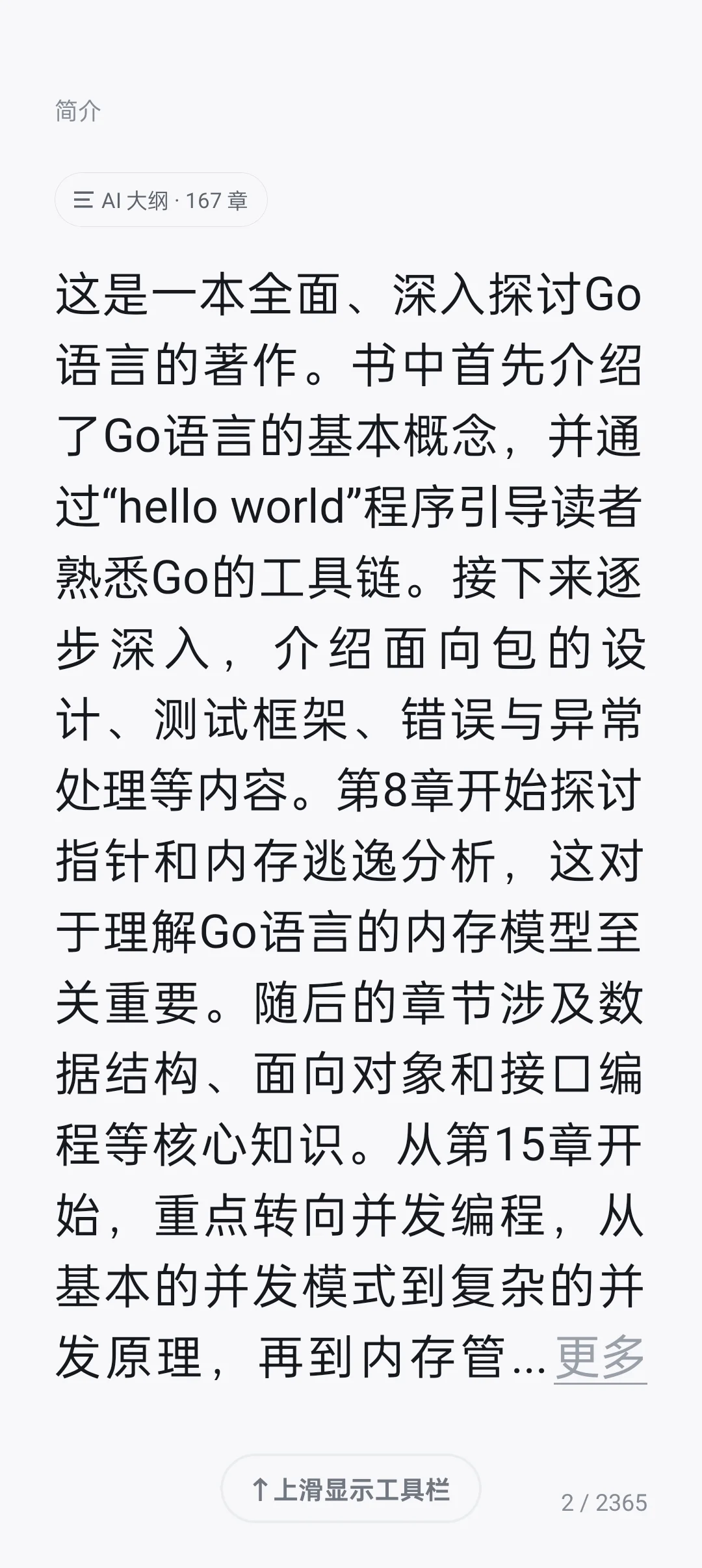 书中首先介绍 Go 语言的基本概念,并通过“hello world”程序引导读者熟悉 Go 的工具链。接下来逐步深 入,介绍面向包的设计、测试框架、错误与异常处理等内容。第 8 章开始探讨指针和内存逃逸分析,这对于理 解 Go 语言的内存模型至关重要。随后的章节涉及数据结构、面向对象和接口编程等核心知识。